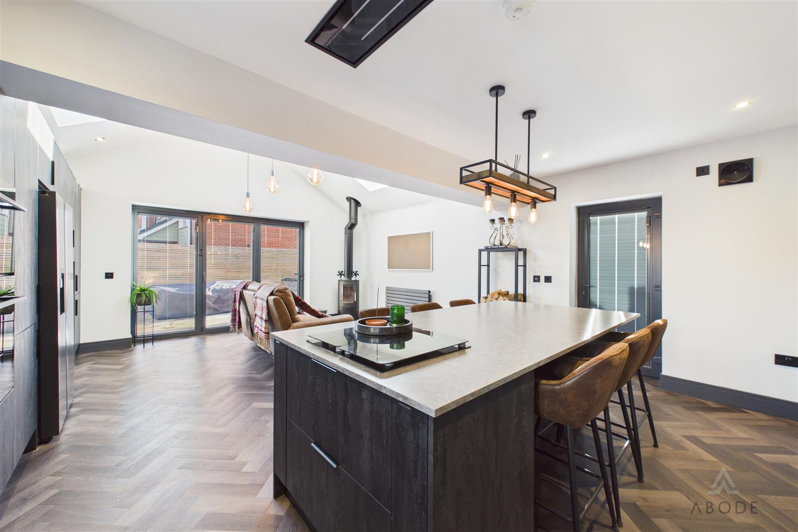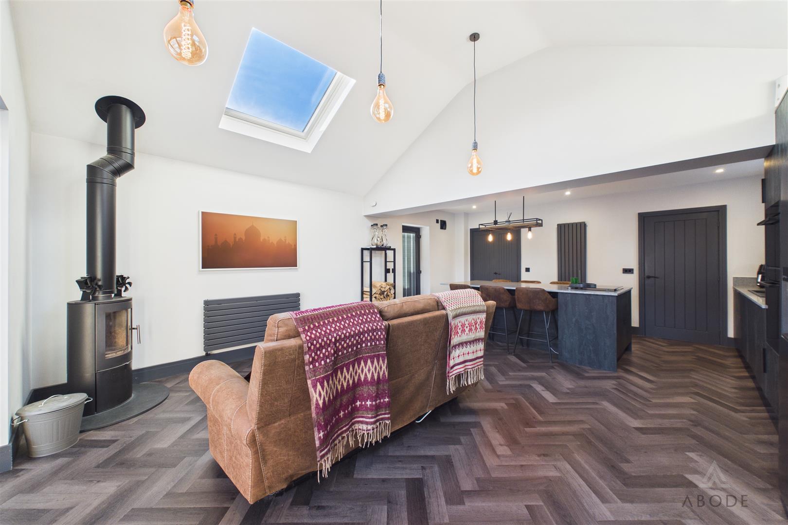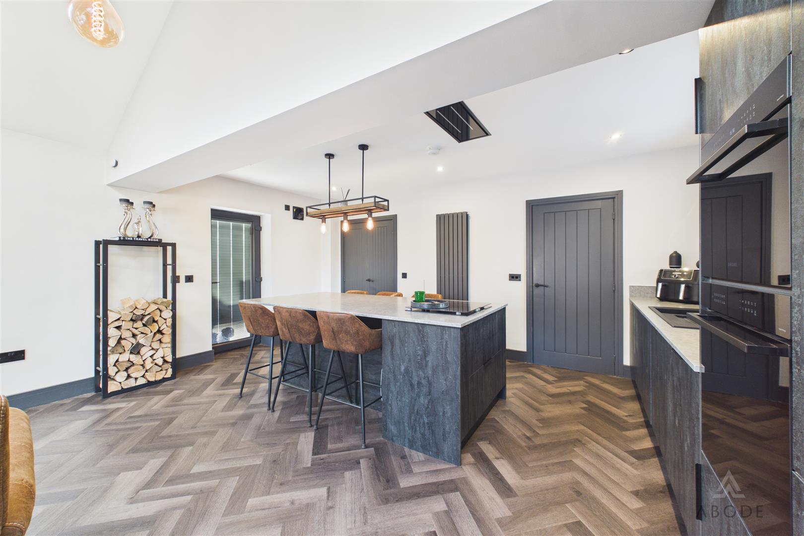 The brand-new kitchen is fitted with modern units and complementary work surfaces, incorporating a central island with breakfast seating and a range of integrated appliances. The herringbone flooring adds warmth and character, while the log-burning stove provides a striking focal point within the living area, creating a cosy yet contemporary atmosphere throughout the year.