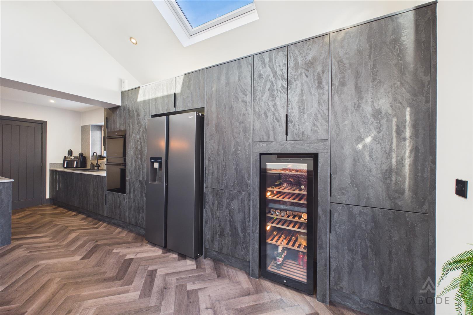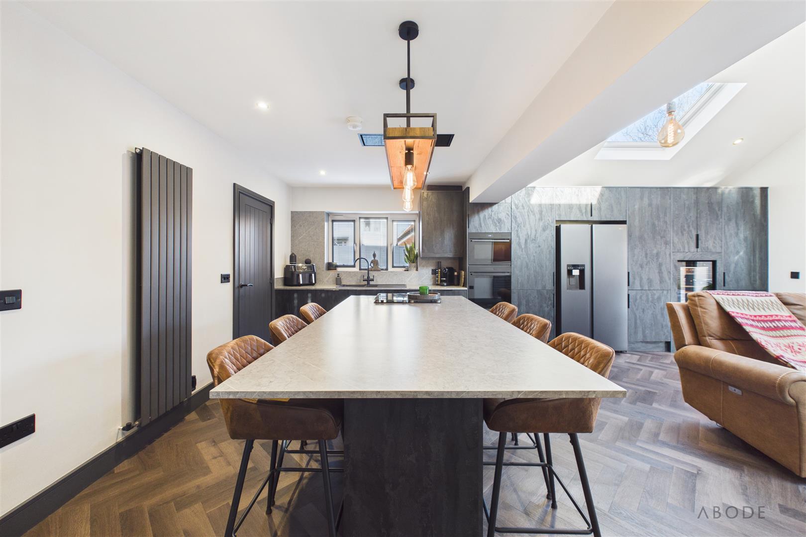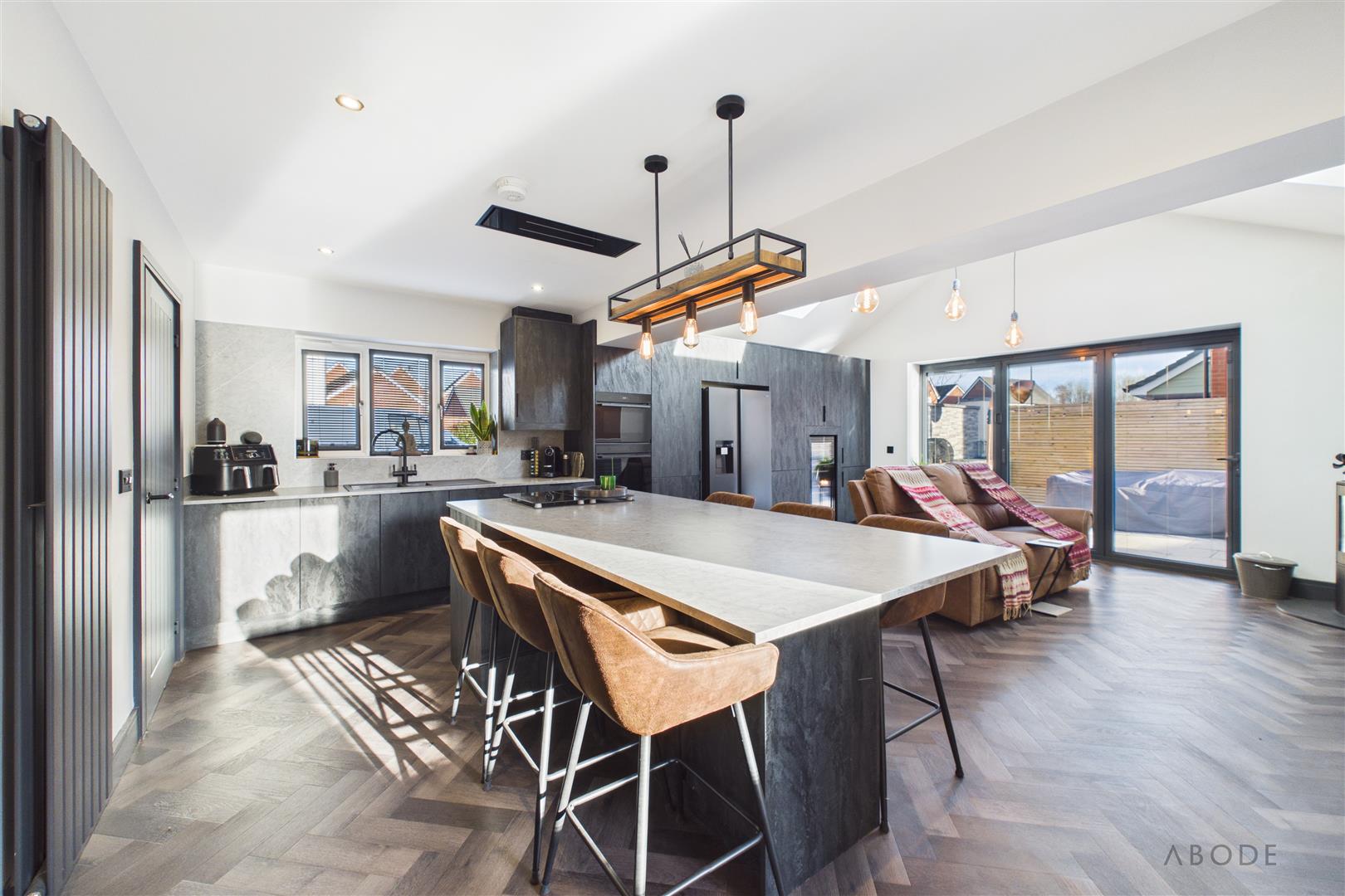 The brand-new kitchen is fitted with modern units and complementary work surfaces, incorporating a central island with breakfast seating and a range of integrated appliances. The herringbone flooring adds warmth and character, while the log-burning stove provides a striking focal point within the living area, creating a cosy yet contemporary atmosphere throughout the year.