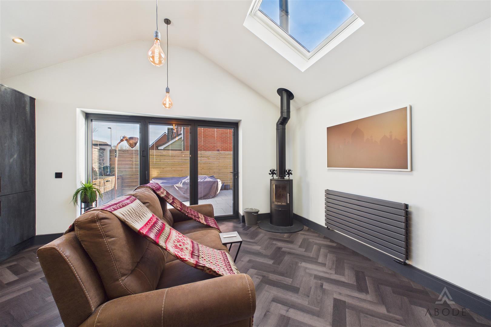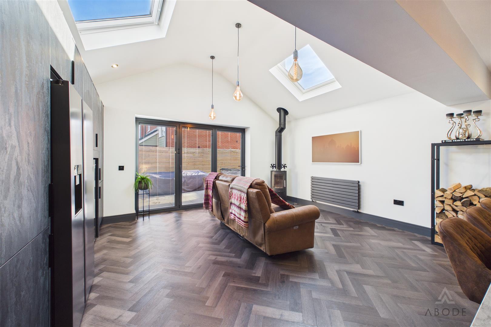 To the rear of the property is the impressive extended Kitchen / Living Area — the true focal point of the home. The extension has been designed with both style and functionality in mind, featuring vaulted ceilings with roof lanterns that flood the space with natural light. Bi-fold doors open directly onto the side garden, seamlessly connecting indoor and outdoor living.