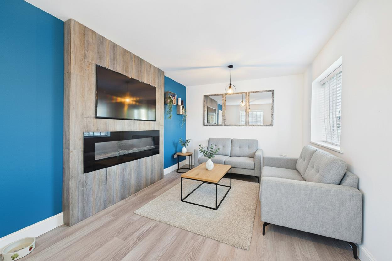 Positioned to the right-hand side of the hallway is the living room, a generous reception space enjoying a pleasant outlook to the front elevation and offering a cosy yet contemporary setting separate from the main family hub.