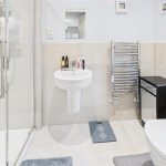 Enclosed double shower cubicle, wash hand basin, low flush wc, chrome heated towel radiator, upvc double glazed window.