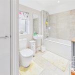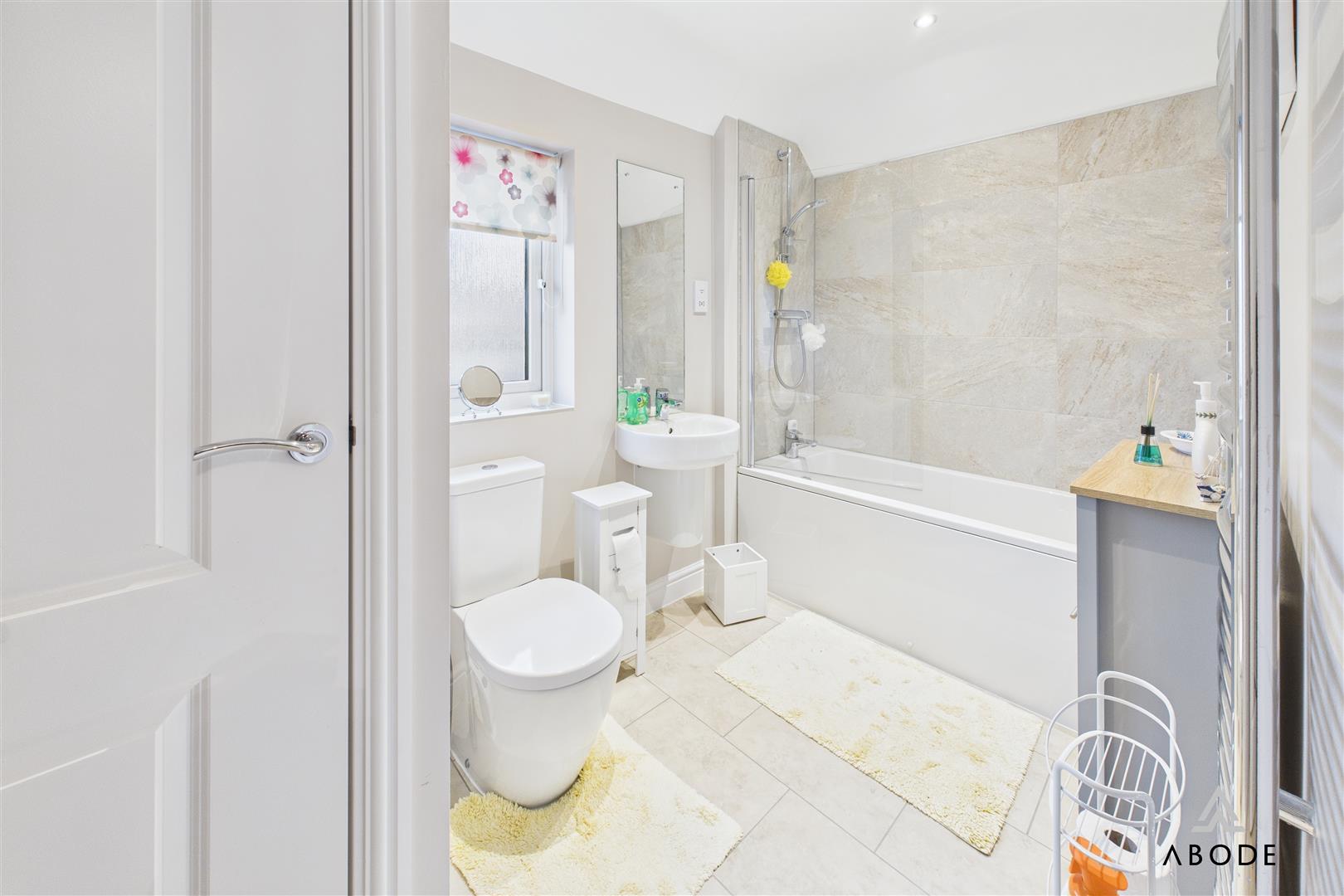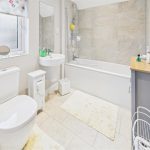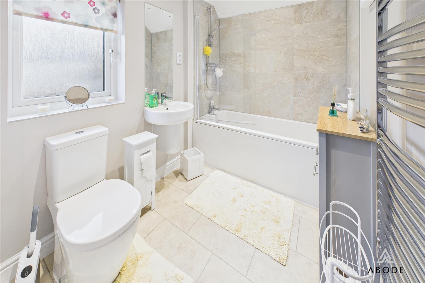 Panel enclosed bath with shower and shower screen, wash hand basin, low flush wc, chrome heated towel radiator, upvc double glazed window and an airing cupboard.