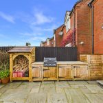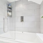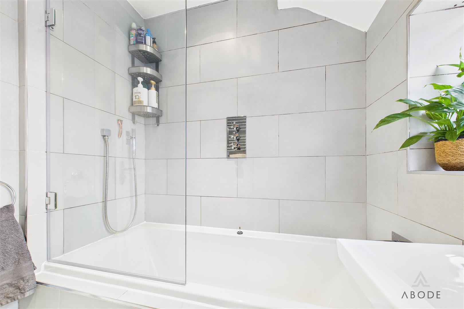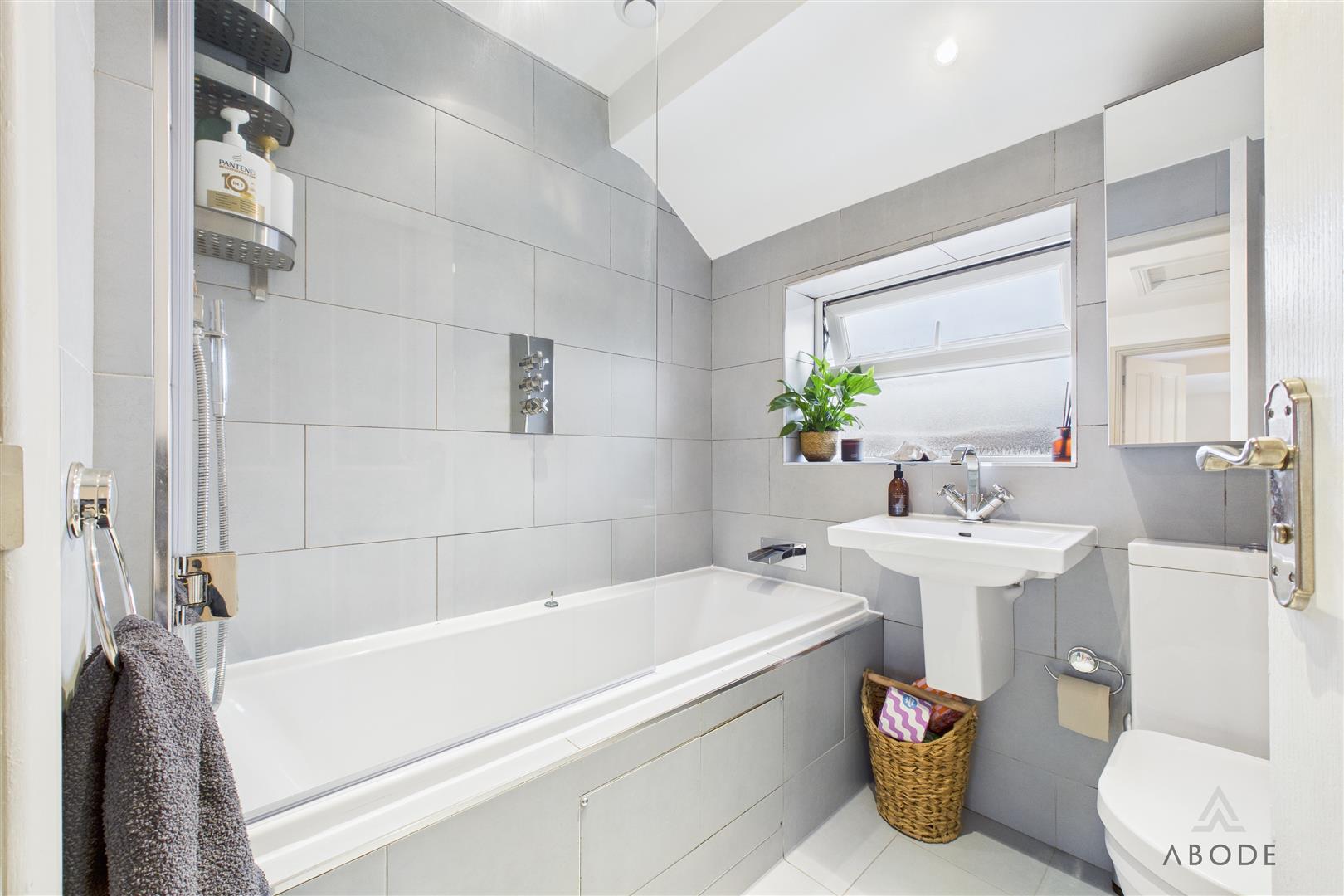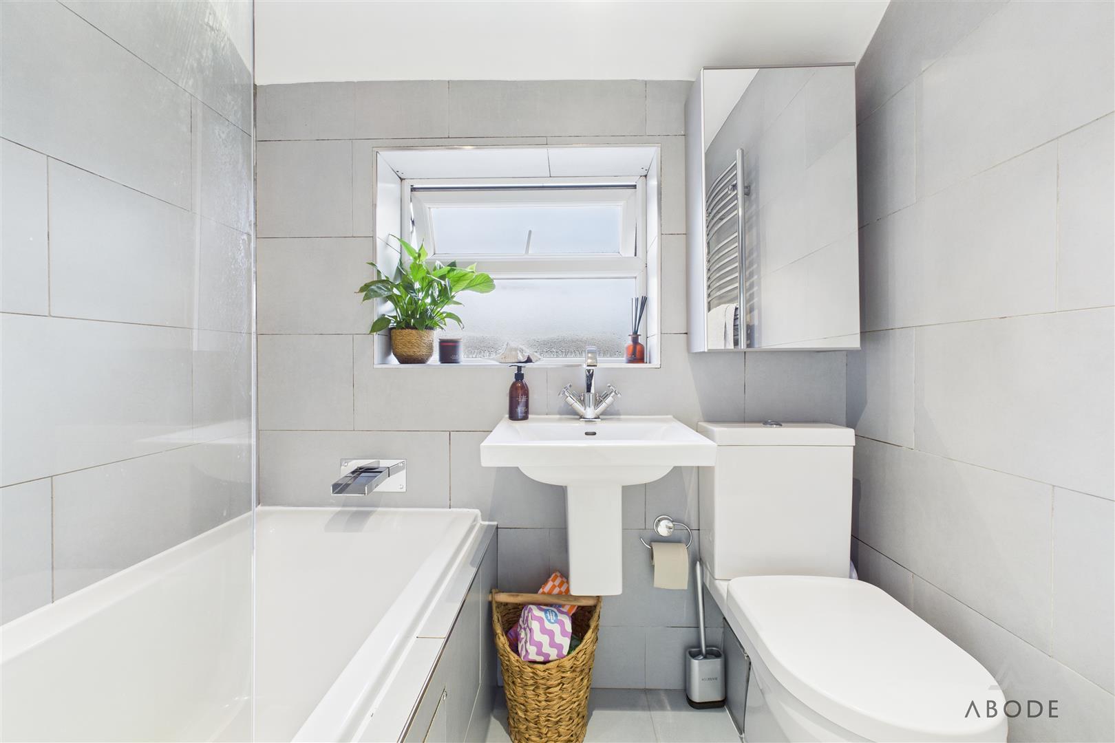 A stylish bathroom with a uPVC double-glazed frosted window to the front elevation and the added luxury of underfloor heating with an external thermostat. Complementary tiling to both floors and walls frames a contemporary three-piece suite comprising a low-level WC with continental flush, floating wash hand basin with mixer tap, and a panelled bath with glass screen and waterfall showerhead. Finished with ceiling spotlights, extractor fan, and a chrome heated towel radiator.