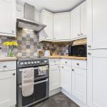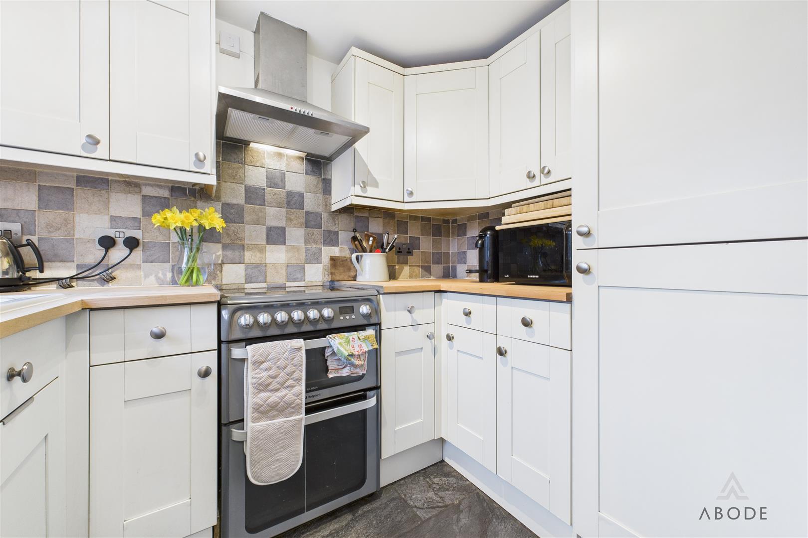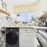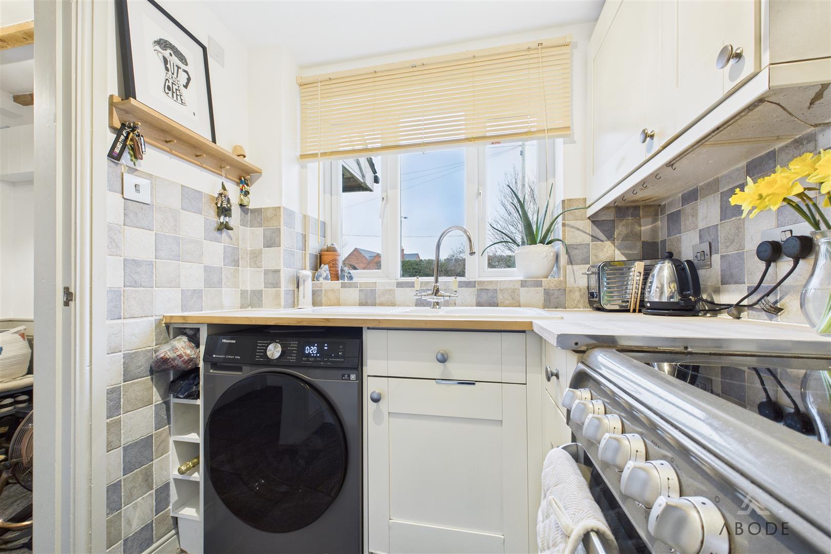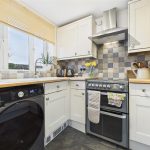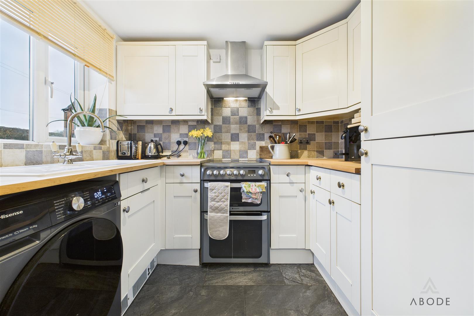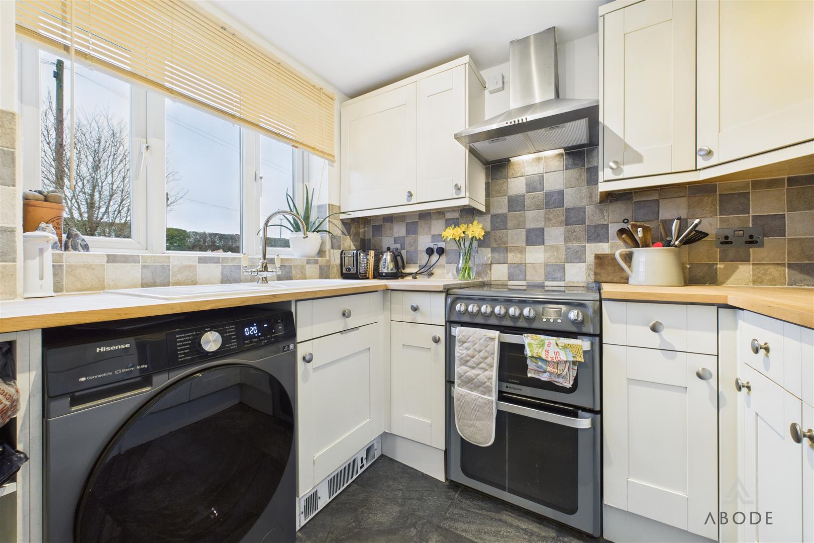 Positioned to the front elevation with a uPVC double-glazed window, the kitchen benefits from complementary tiled flooring and is fitted with a range of matching base and wall units with wood-block preparation work surfaces. Integrated appliances include a 1½ ceramic sink with mixer tap, hob with oven and grill, and a stainless-steel extractor hood. There is also space and plumbing for freestanding white goods, along with room for a fridge and freezer.