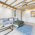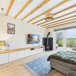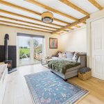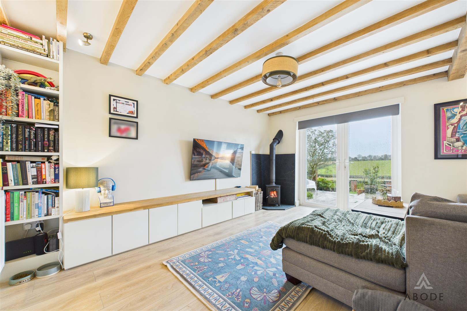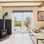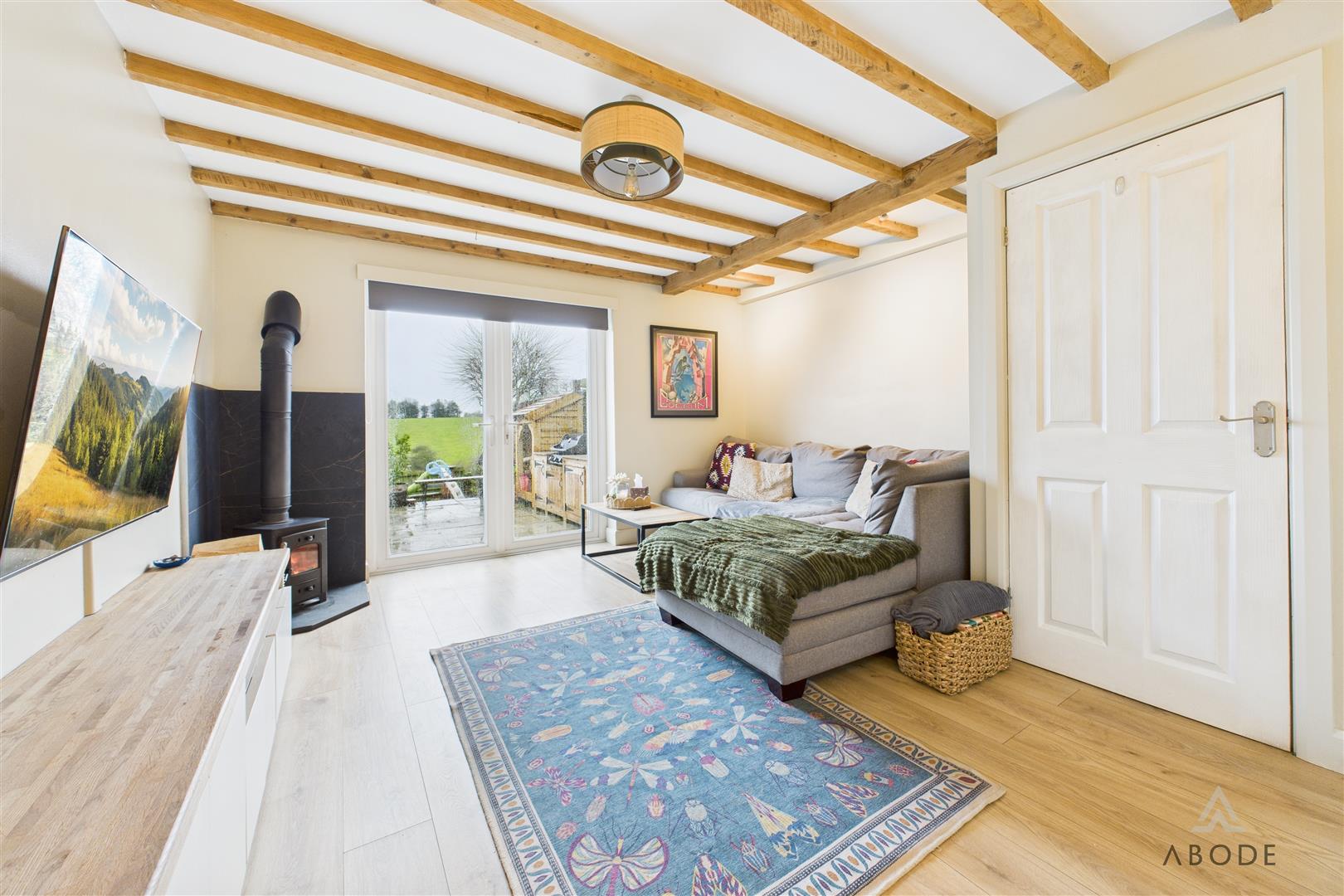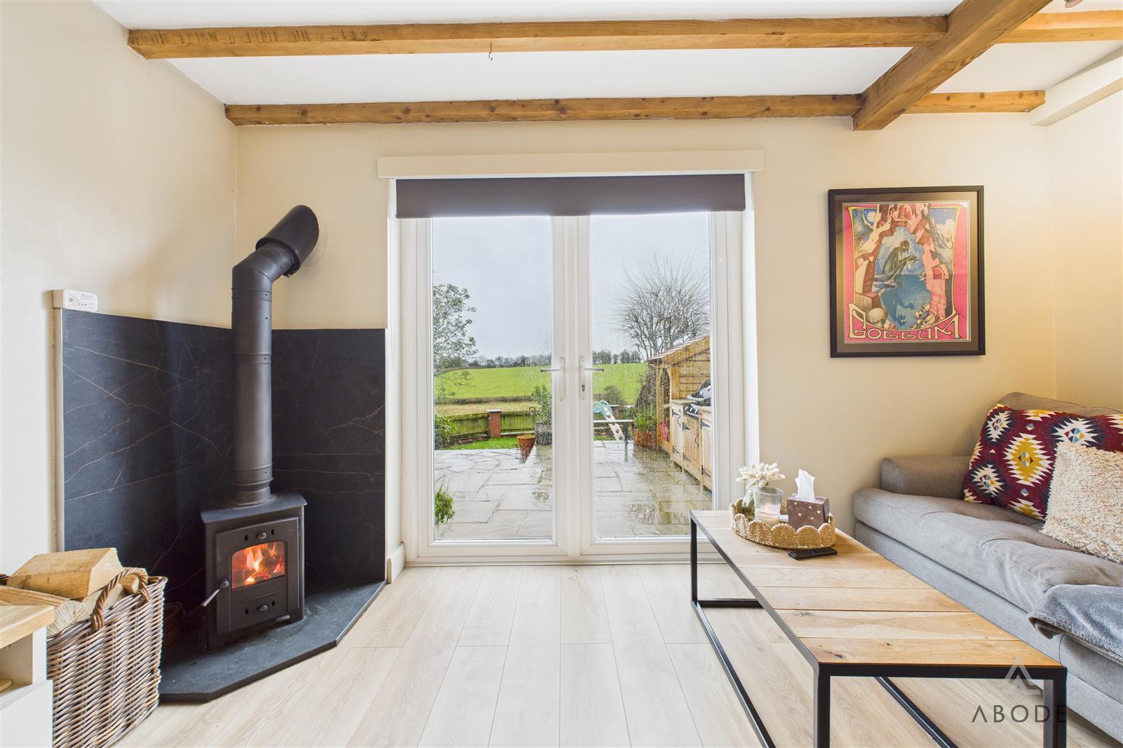 A spacious and characterful reception room featuring panelled flooring and a striking cast-iron log-burning fireplace set on a tiled hearth. Exposed beams and trusses enhance the sense of period charm, while additional features include a central heating radiator, TV aerial point, carbon monoxide detector, and a useful under-stairs storage cupboard. uPVC double-glazed French doors open out to enjoy far-reaching views over open fields and surrounding agricultural land.