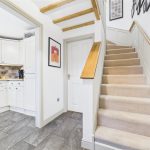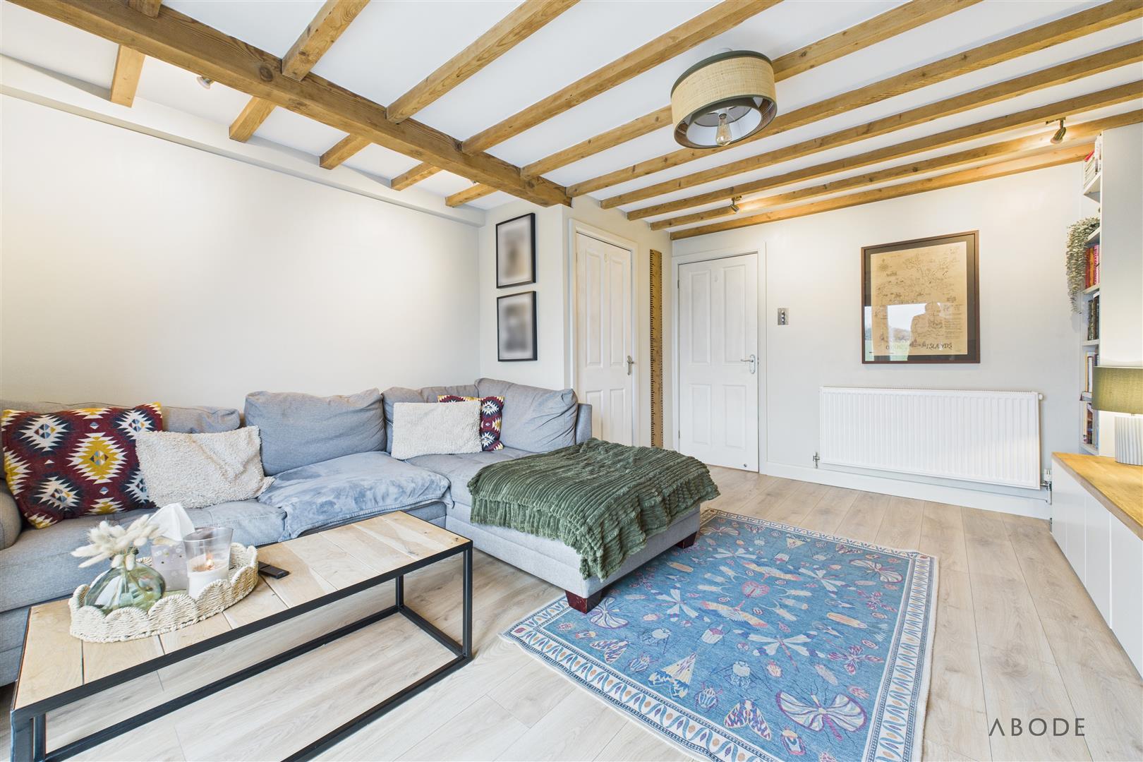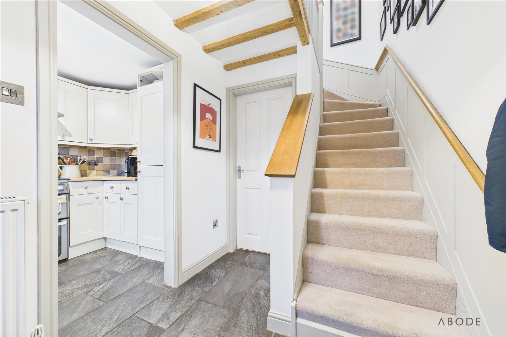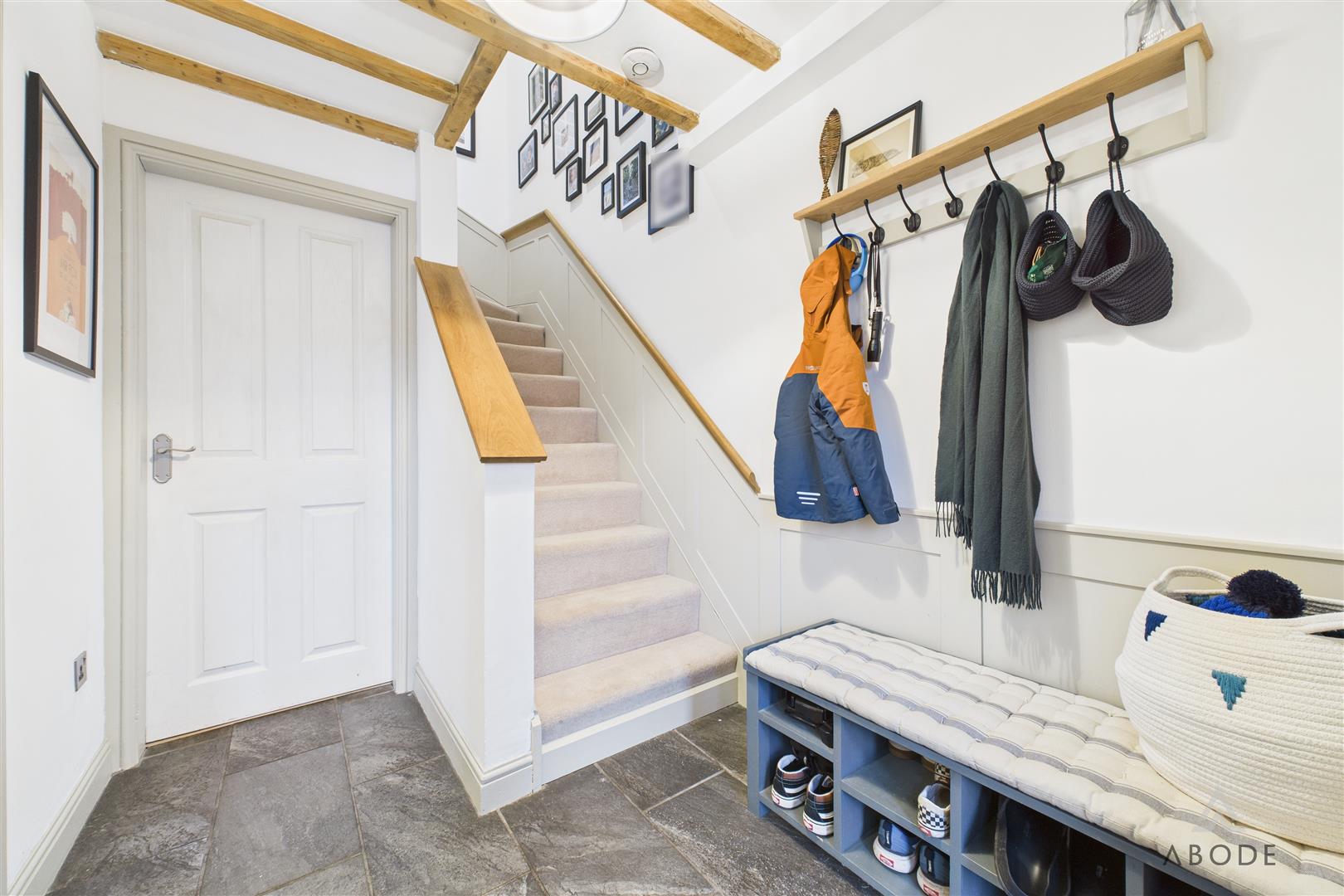 Entered via a uPVC double-glazed front door, the welcoming hallway features tiled flooring throughout and a staircase rising to the first-floor landing. Characterful bespoke timber panelling and exposed ceiling beams add charm, complemented by a central heating radiator, coat hooks, and a useful meter cupboard. An opening leads through to: