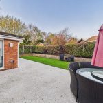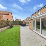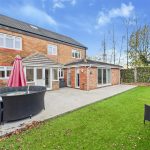 The rear garden offers an attractive and manageable outdoor space, with a lawn bordered by established planting and a generous patio running along the rear of the property. The bi-fold doors from the garden room open directly onto this patio, making it ideal for barbecues, entertaining or simply relaxing outside.