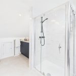 A spacious dressing area adjoins the bedroom, complete with built-in storage and space for further wardrobes or dressing furniture. The suite is completed by a stylish en-suite shower room, appointed with a large glass shower enclosure, modern tiling, wash basin with storage and WC.