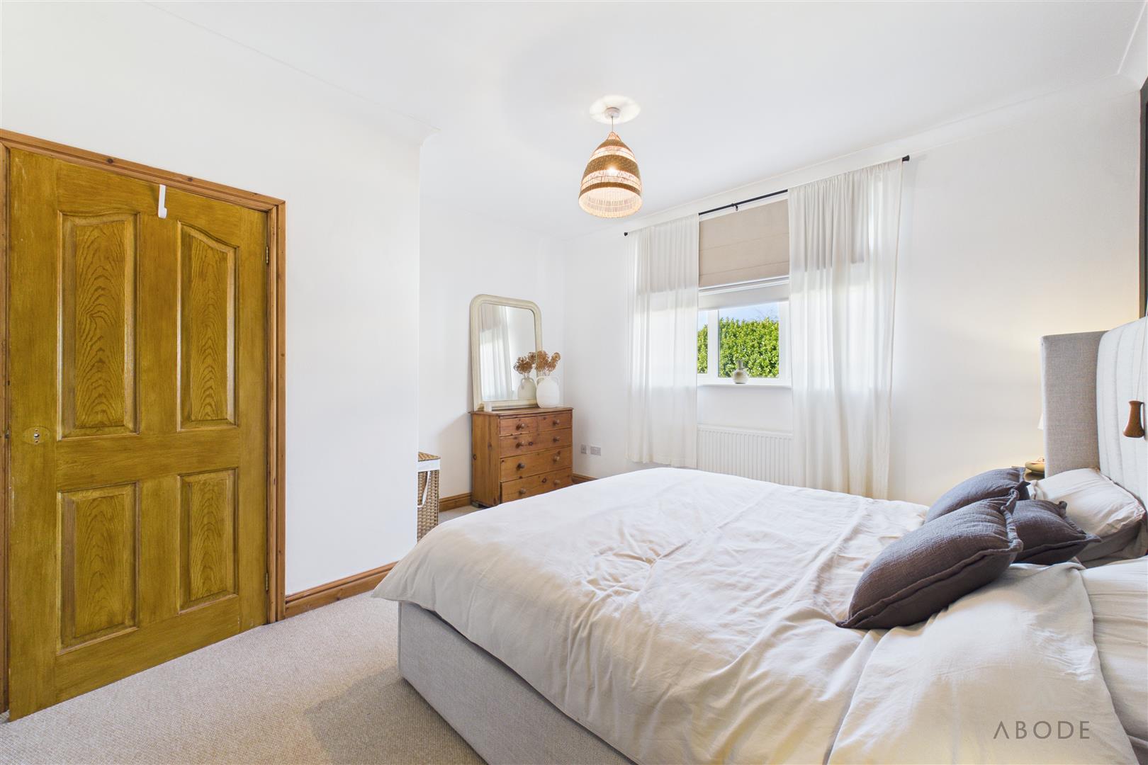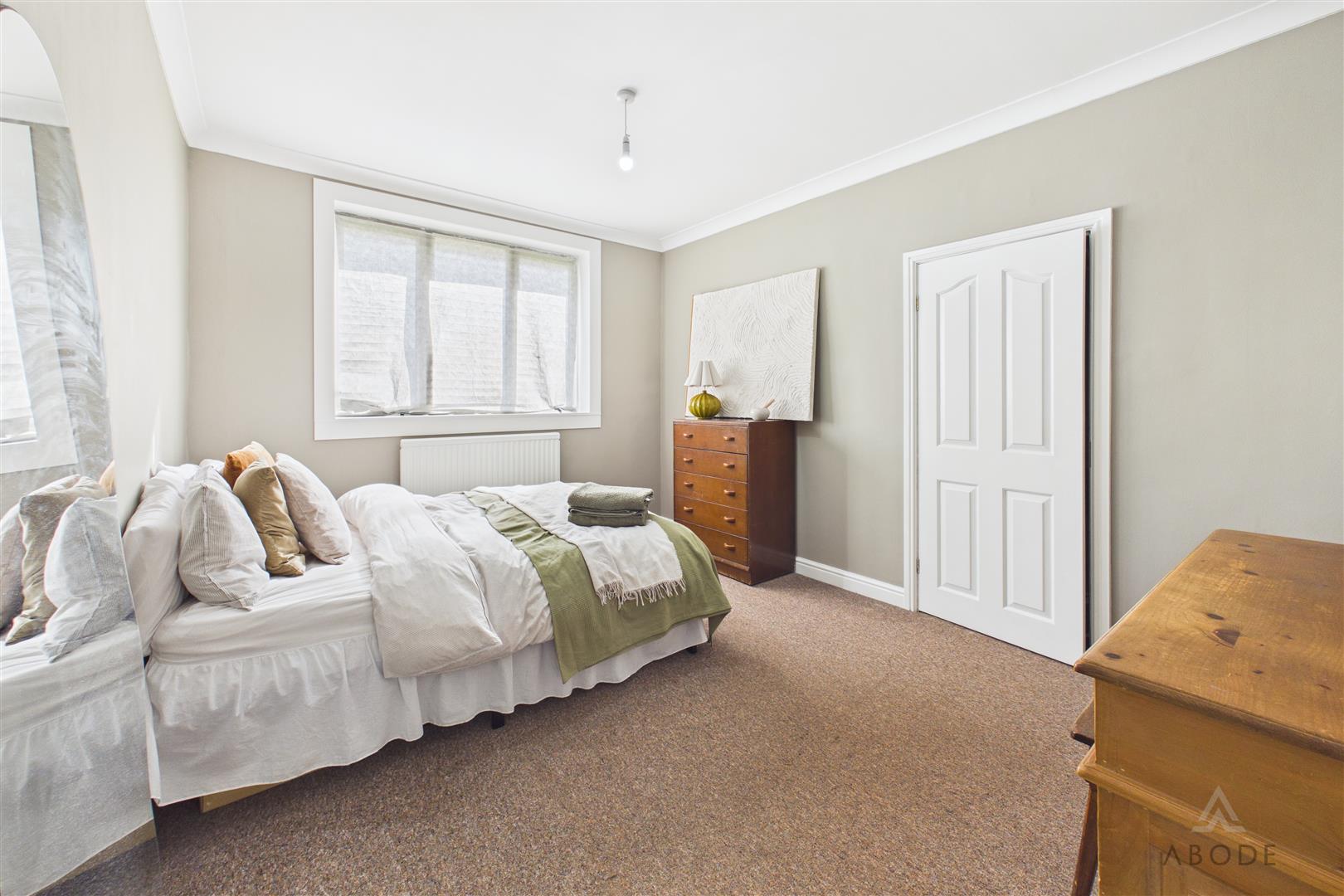 A well-proportioned bedroom with a uPVC double glazed window to the front elevation, central heating radiator, TV aerial point, and a feature panelled wall.