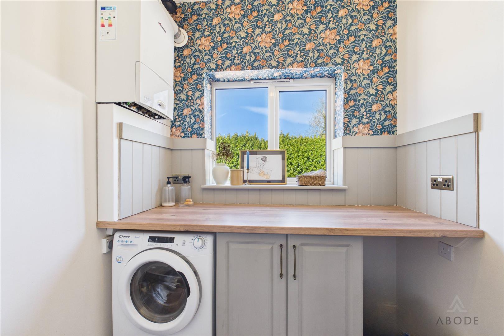A practical utility area with a uPVC double glazed window to the front elevation. Fitted with base level storage cupboards and wood block effect work surfaces, along with plumbing for under-counter appliances. The room also houses the Worcester Bosch gas central heating boiler, electrical consumer unit, electric meter, and carbon monoxide detector, with loft access via hatch.