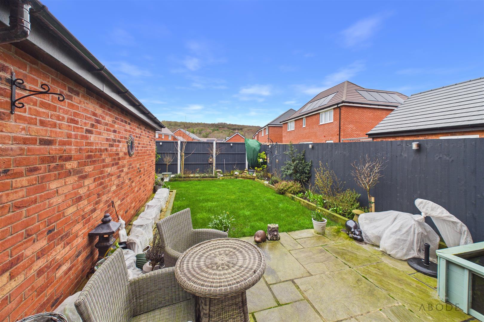 To the rear of the property is a landscaped garden designed for ease of maintenance, featuring a patio seating area directly outside the French doors and a lawn with planted borders. The garden is enclosed by fencing and provides a pleasant outdoor space for entertaining and relaxing.