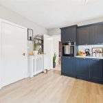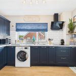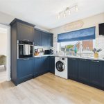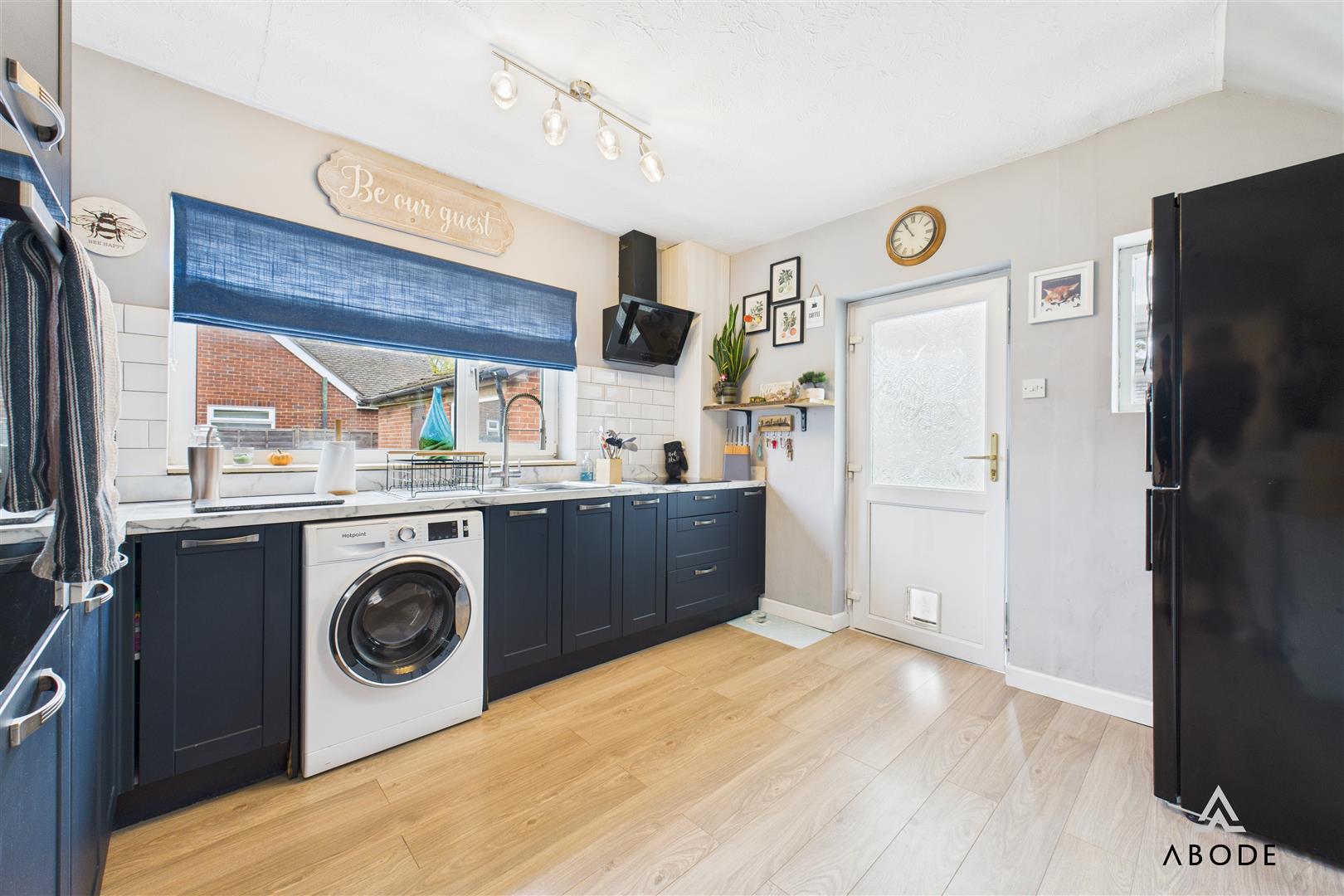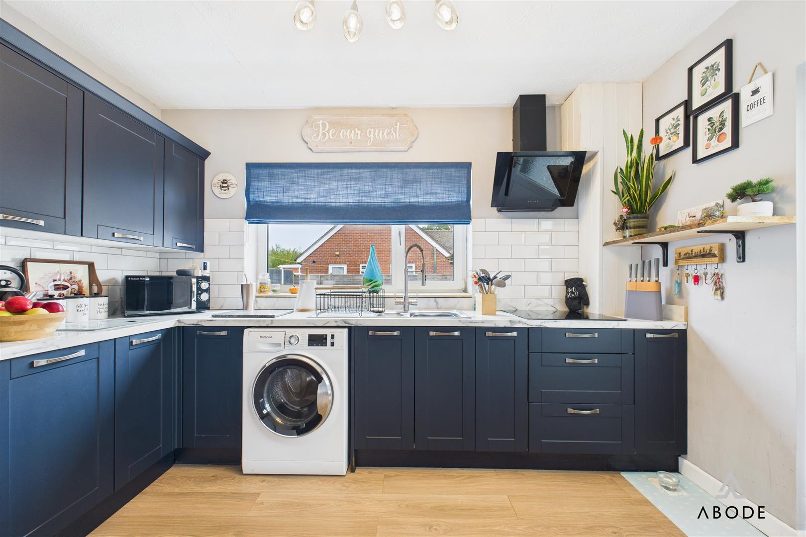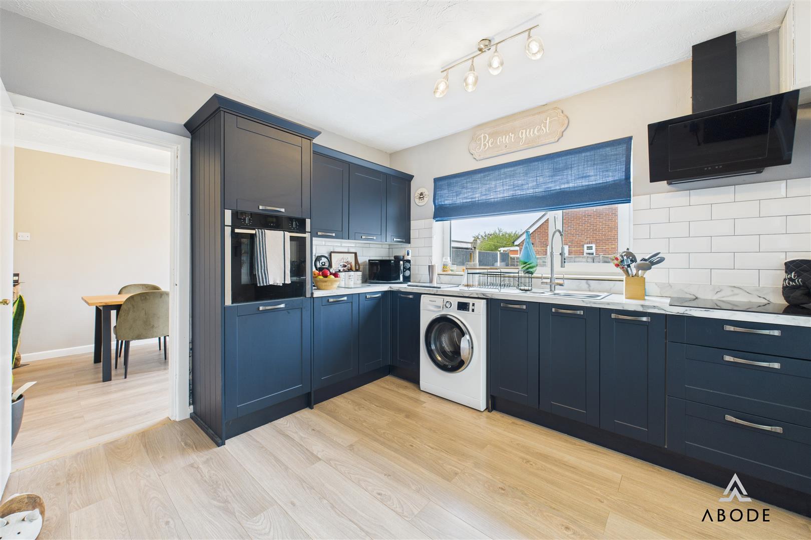 A well-appointed and modern kitchen fitted with a range of matching base and eye-level units and drawers with marble-effect drop-edge work surfaces and complementary tiled splashbacks. Integrated features include a one-and-a-half stainless steel sink and drainer with spray mixer tap, a newly fitted four-ring induction hob with extractor, and an electric oven and grill. There is plumbing and space for freestanding under-counter white goods, soft-close cupboards, pull-out recycling bins, and cutlery drawers. A glazed side window, central heating radiator, and a UPVC double-glazed frosted door open into the conservatory.