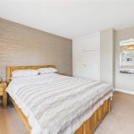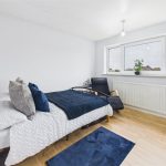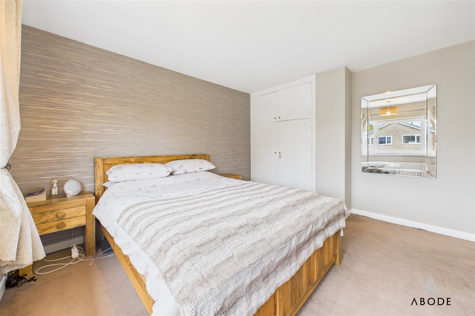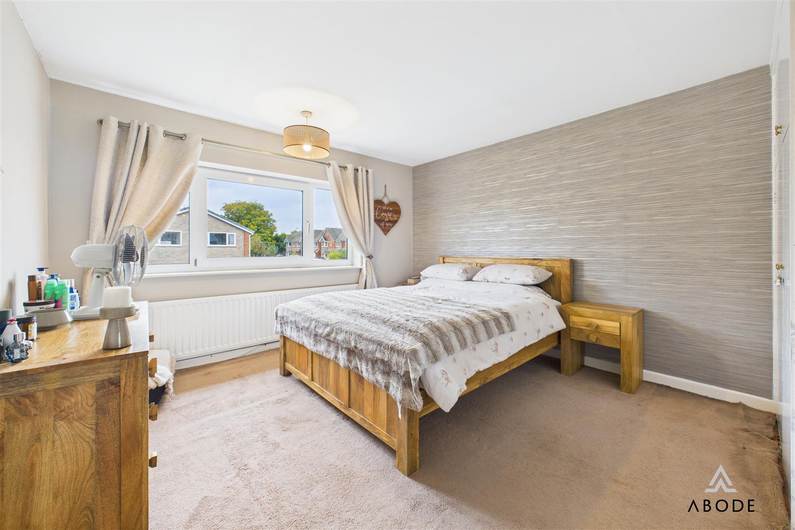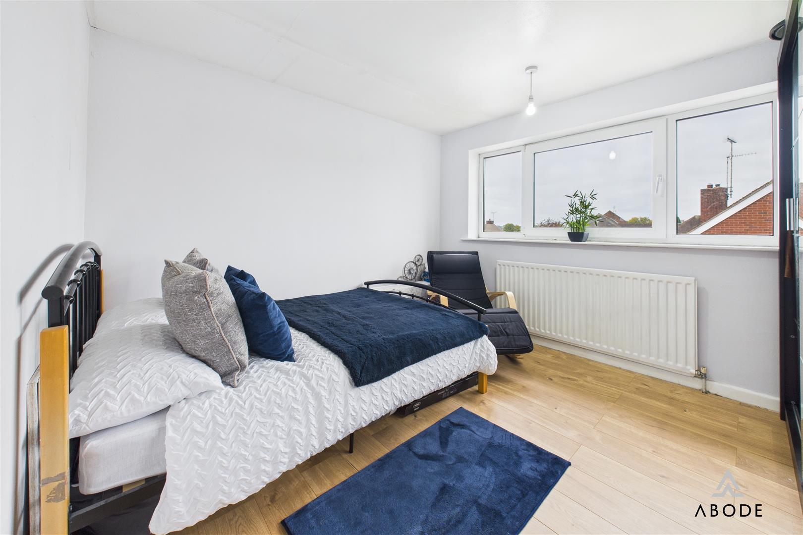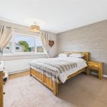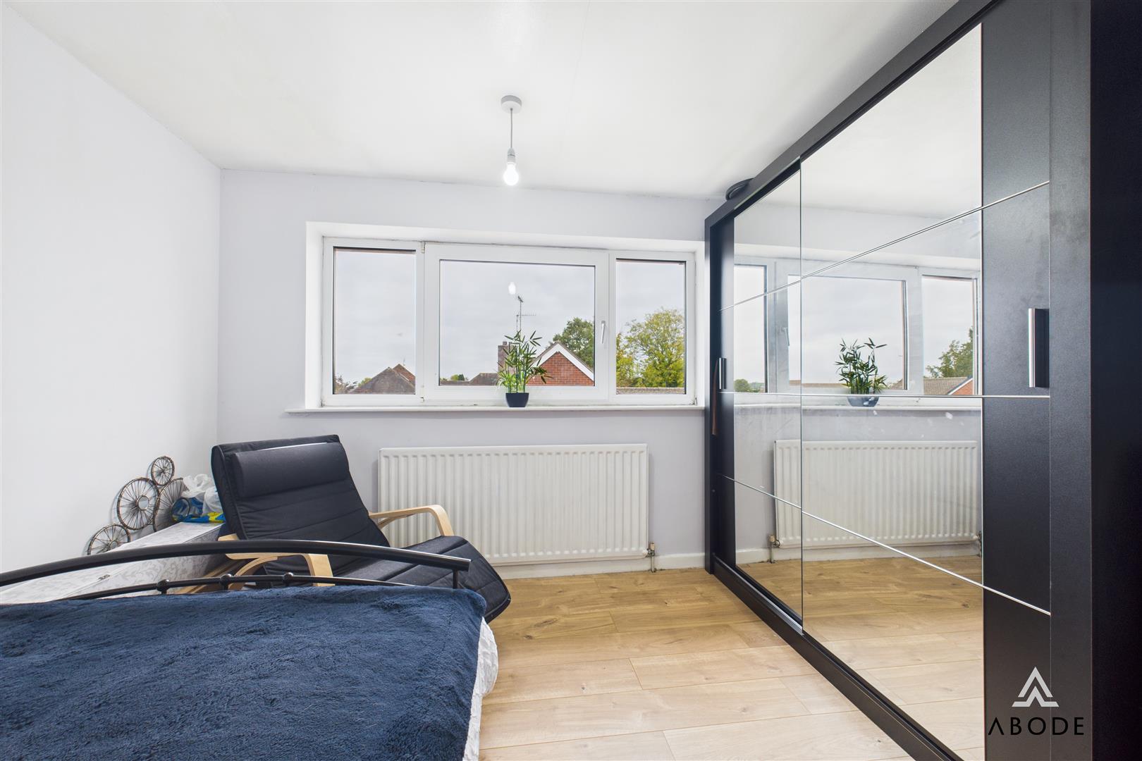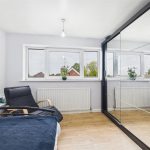 A generous double bedroom with a UPVC double-glazed window to the front elevation, central heating radiator, and a built-in double wardrobe with hanging rails and shelving.