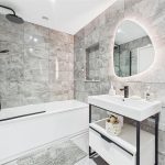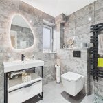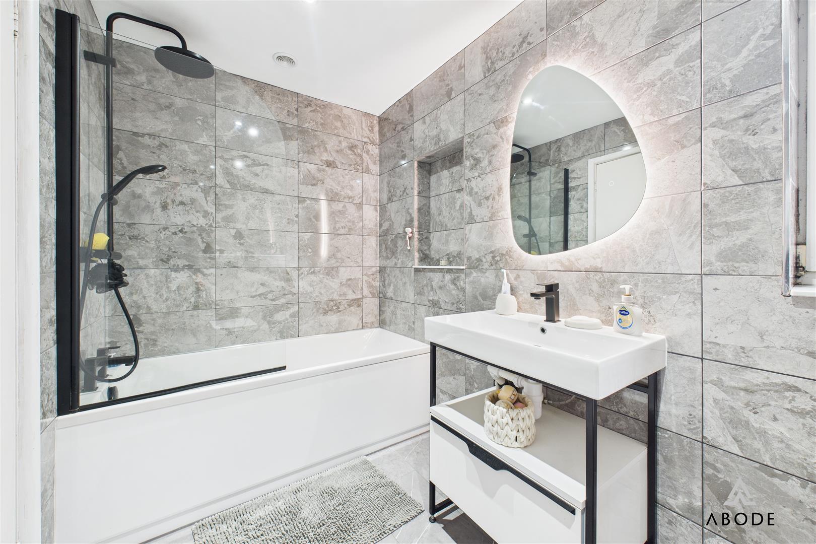 A beautifully presented modern bathroom with a UPVC double-glazed frosted window to the rear elevation, fitted with a three-piece suite comprising a low-level WC with continental flush, bath with glass shower screen and waterfall showerhead, and wash hand basin with mixer tap. Finished with complementary floor and wall tiling, heated towel radiator, recessed spotlights, and extractor fan.