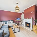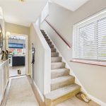 Entered via a UPVC double-glazed frosted front door with a matching side window. The hallway features a staircase rising to the first-floor landing, a useful under-stairs storage cupboard, central heating radiator, recently refitted electrical consumer unit, telephone point, and a meter cupboard housing the electric meter. Internal doors lead to the main ground-floor rooms.