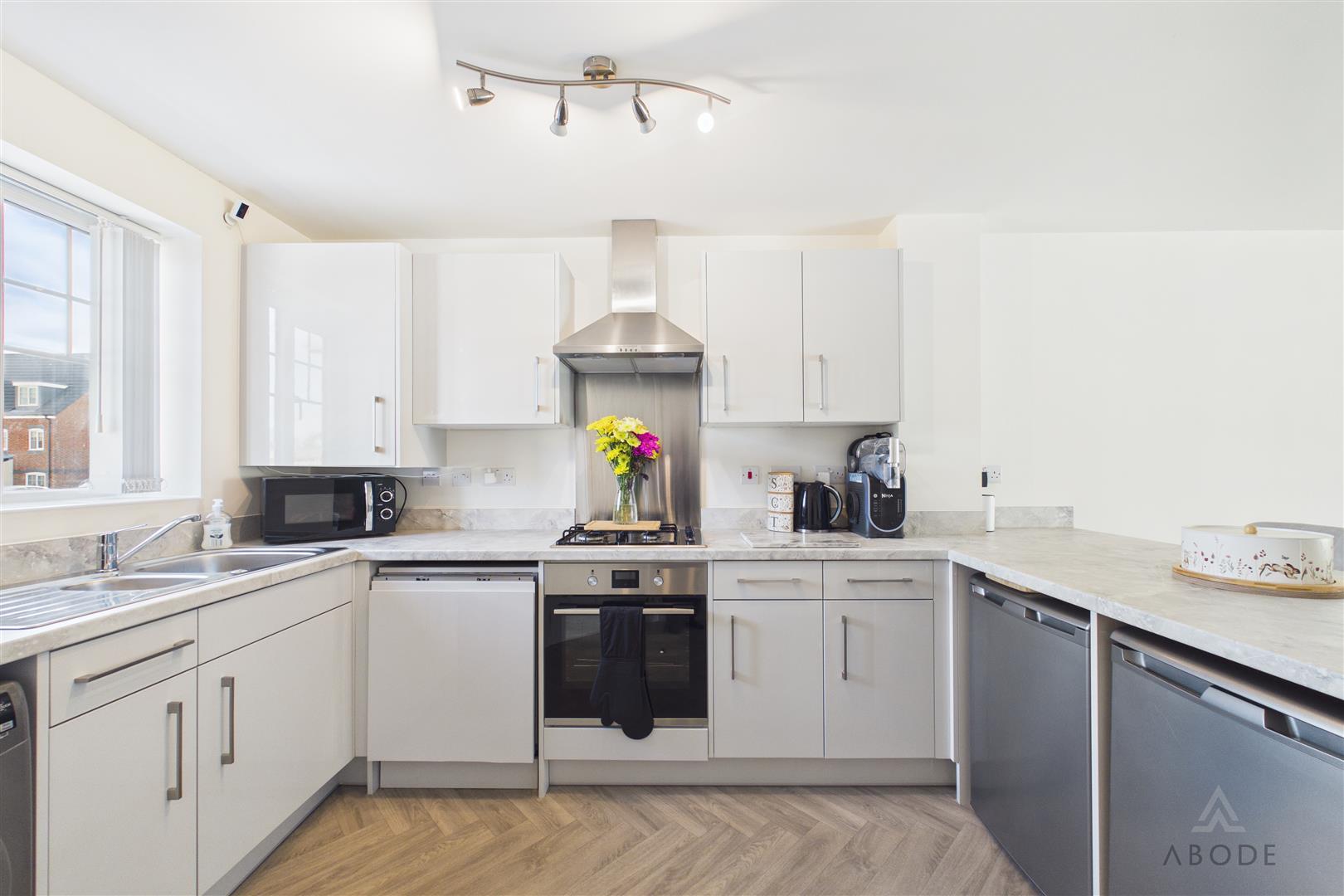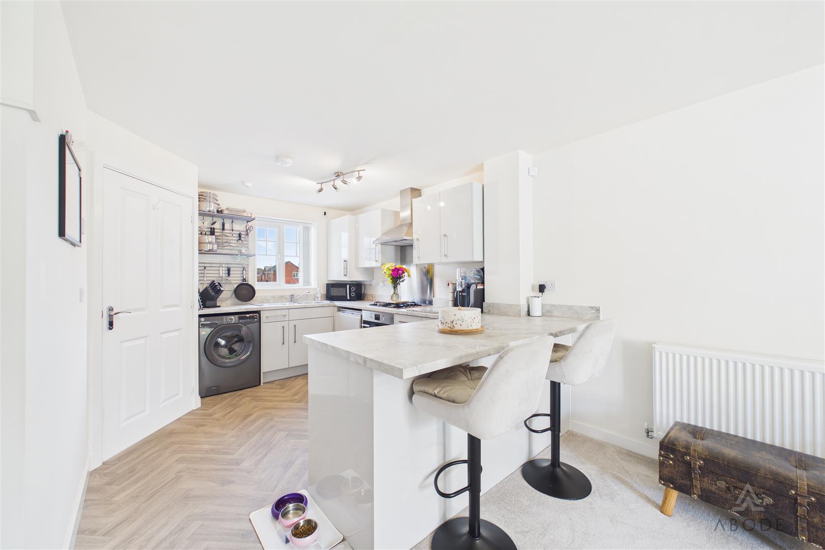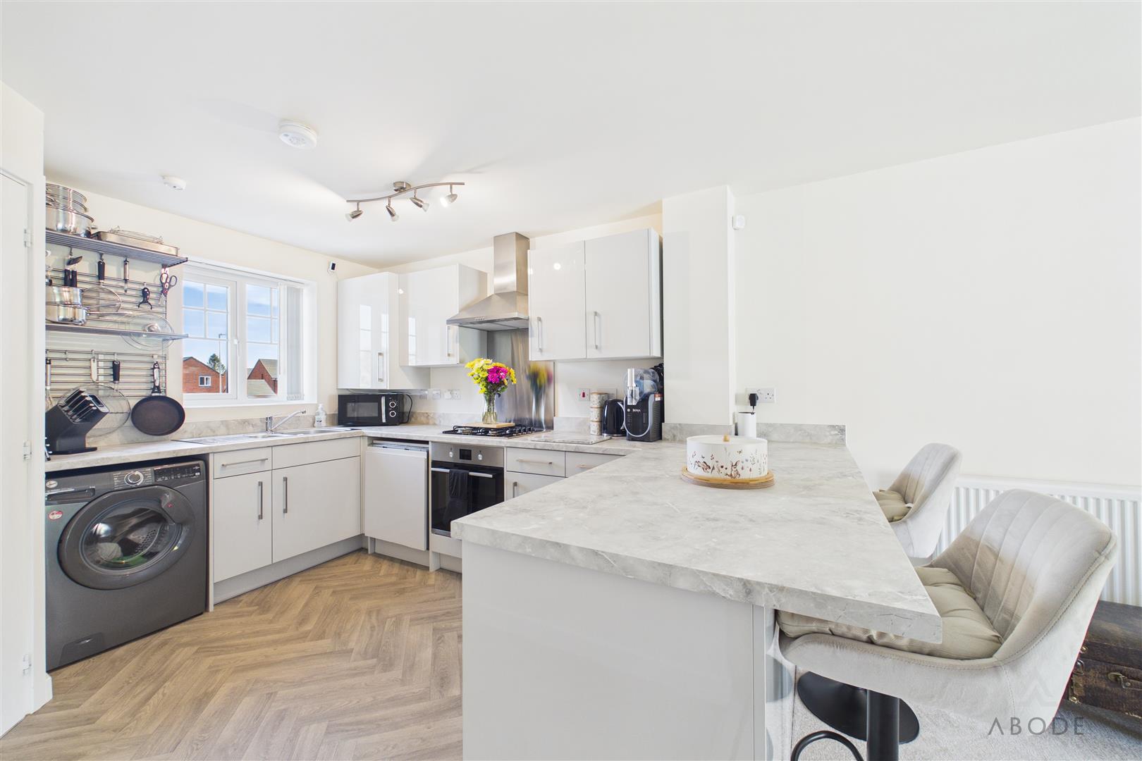 Modern base and eye level units with complimentary worktops, one and a half bowl stainless steel sink with draining board, integrated dishwasher, cooker and hob with extractor hood above. Space and plumbing for a washing machine, and under counter fridge and freezer, UPVC double glazed window to the front elevation and breakfast bar.