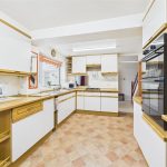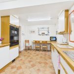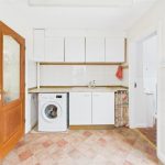 The kitchen is fitted with matching wall and base units, work surfaces with inset sink and drainer, integrated oven and hob, and space for further appliances. A door from the kitchen leads through to a utility room, providing additional appliance space, storage, and a rear door to the garden. Off the utility is a ground floor WC with wash-hand basin.