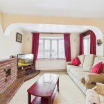 The property is entered through the front entrance door into a large living room, featuring a wide bay window to the front, a central brick fireplace, and ample space for a range of seating and furniture. A door leads to the dining room, which overlooks the rear garden and has sliding doors opening into the conservatory—a bright and airy space enjoying panoramic garden views and access to the patio.