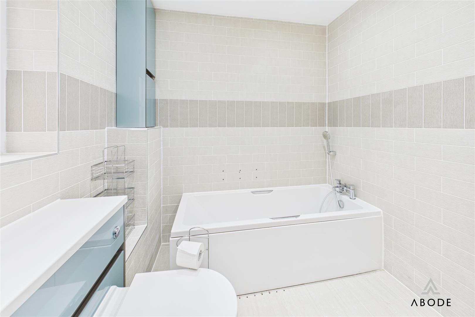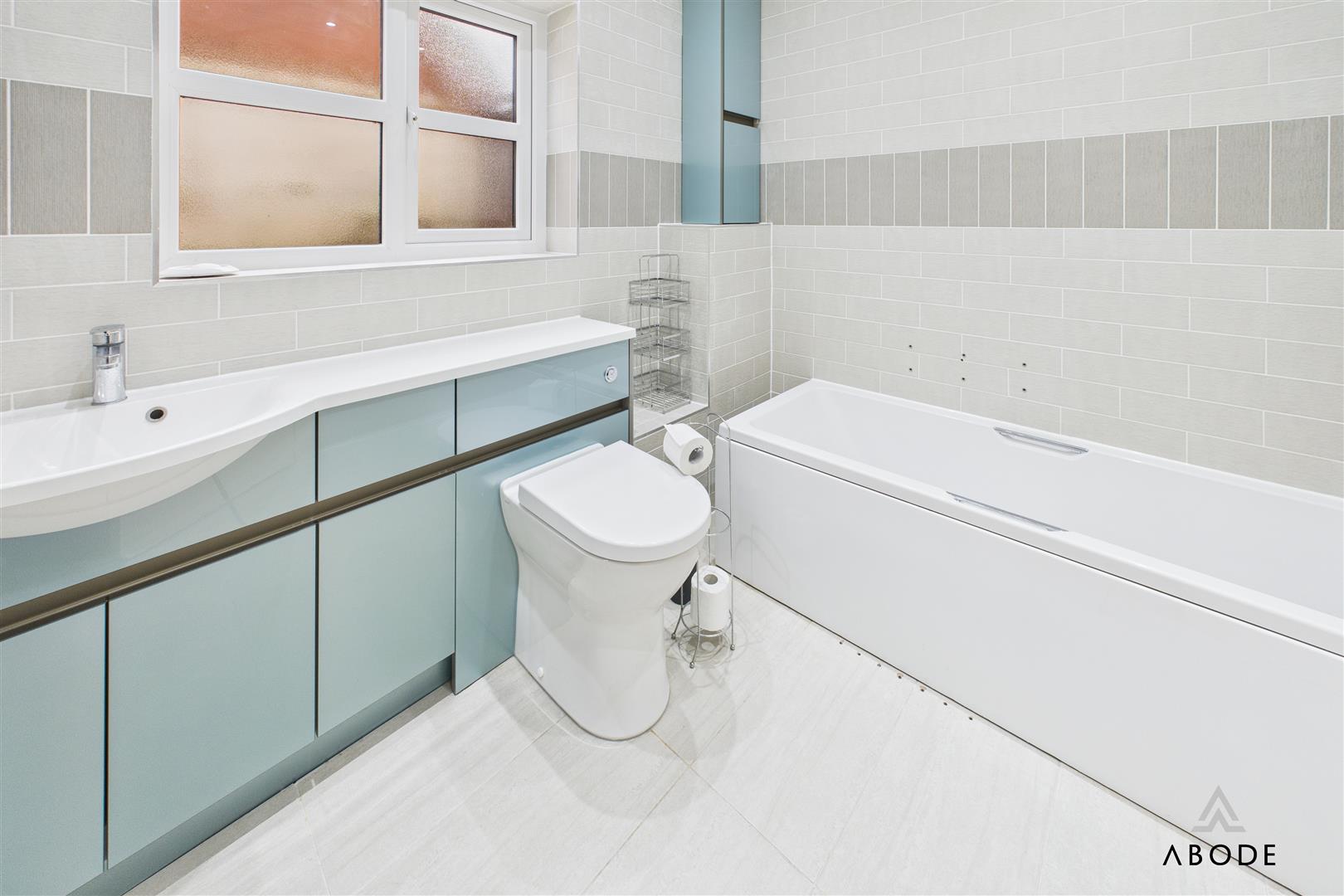 Bath with a shower attachment tap, wash hand basin, low flush wc, fitted cupboards, heated towel radiator and upvc double glazed window.