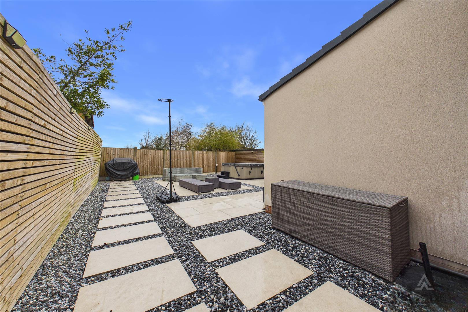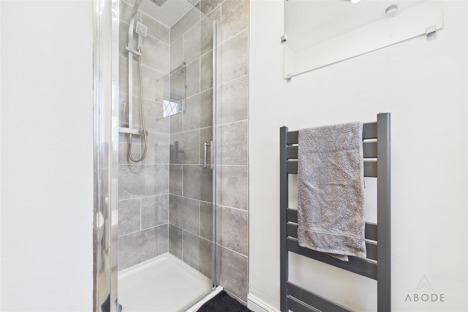 Fitted with a modern three-piece suite comprising a low-level WC, wash hand basin with waterfall mixer tap, and shower cubicle with waterfall shower head. Complementary tiling, heated towel radiator, shaving point, extractor fan, and a UPVC double glazed frosted window to the side elevation complete the space.