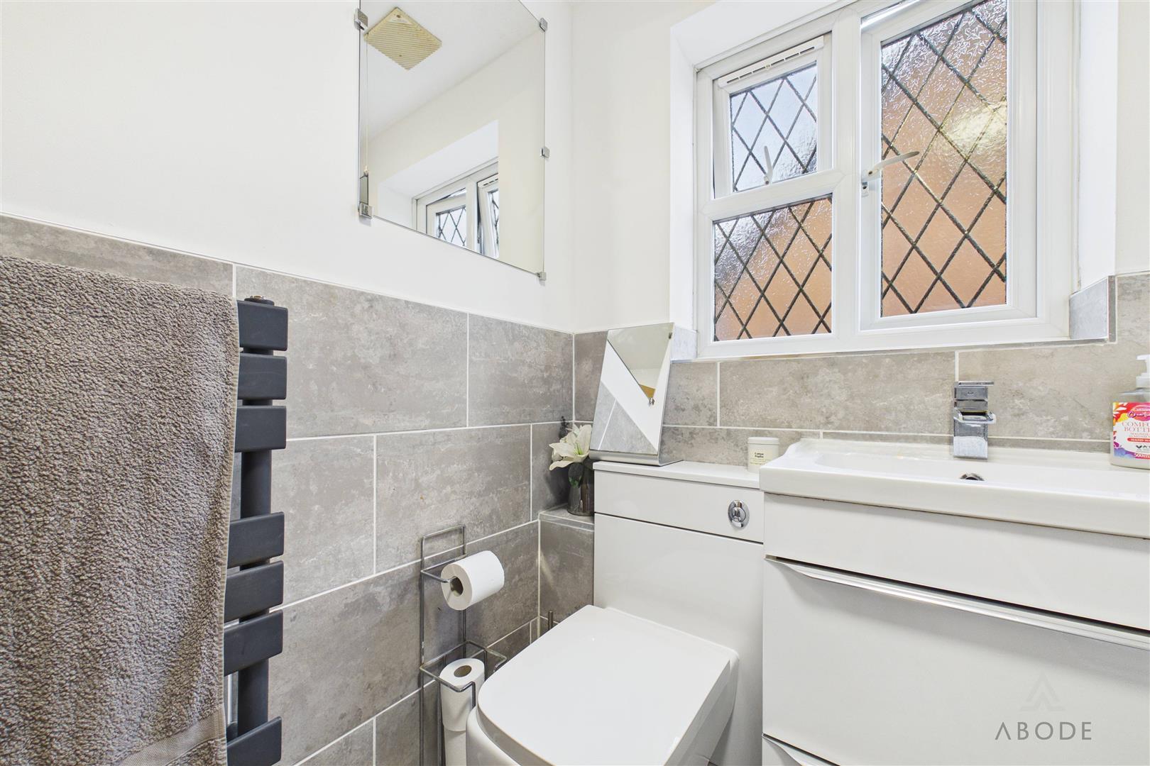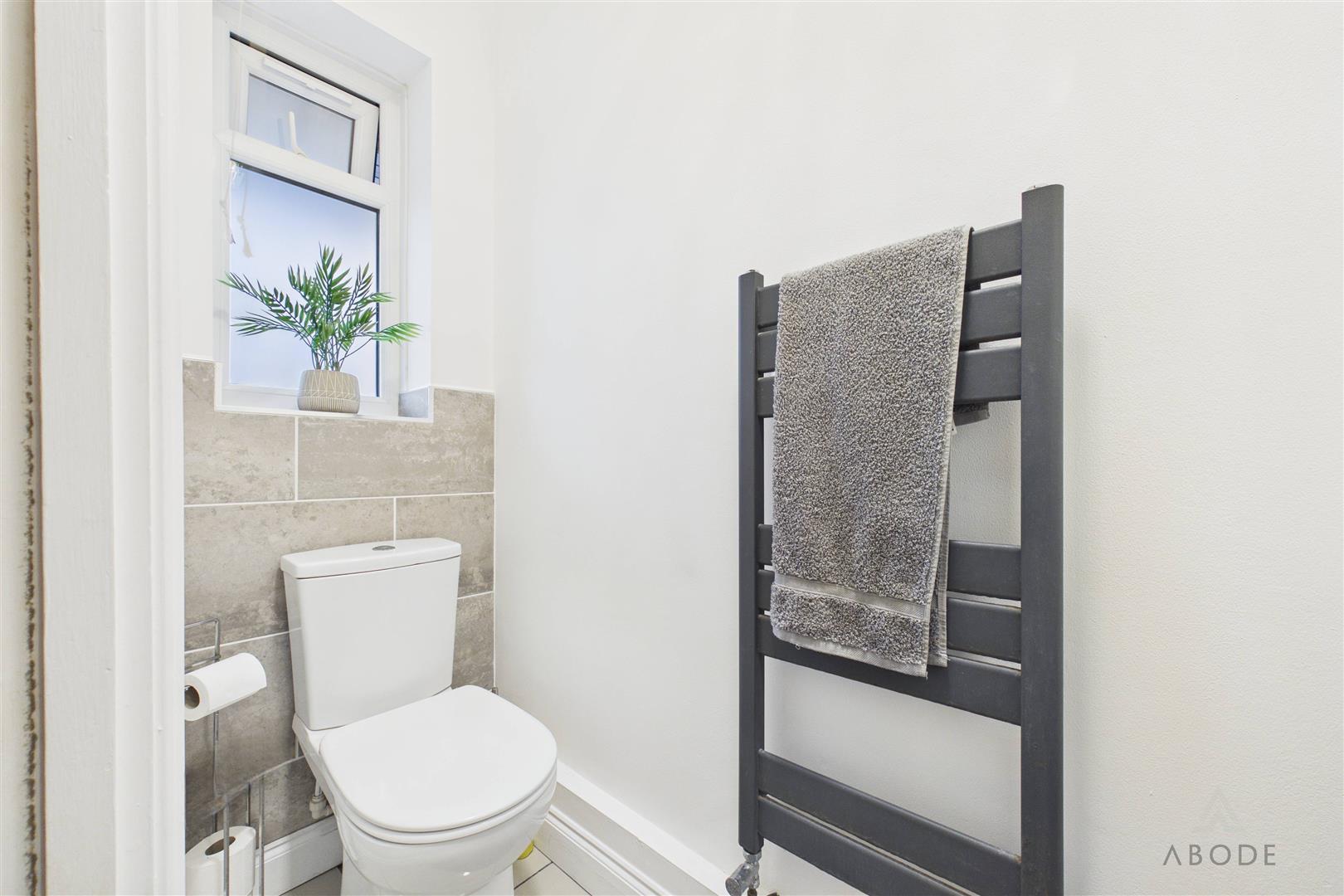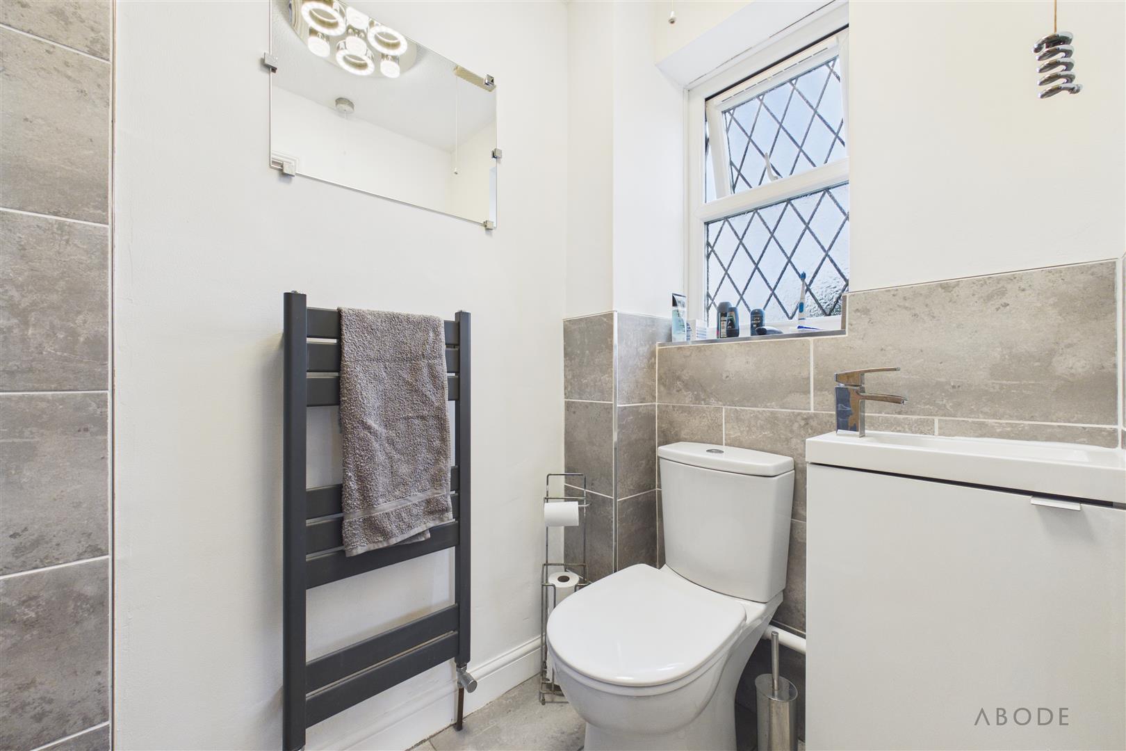Fitted with a low-level WC with concealed cistern and a pedestal wash hand basin with waterfall mixer tap. Finished with complementary tiling, a heated towel radiator, and a UPVC double glazed frosted window to the front elevation.