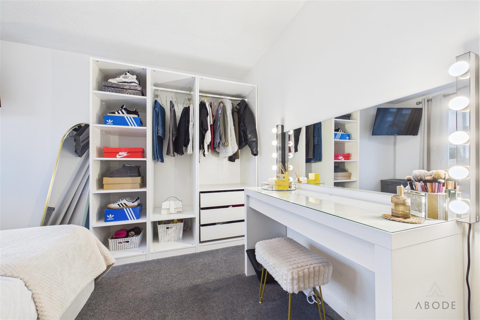 With access to the loft via a hatch, a storage cupboard with shelving, smoke alarm, and a UPVC double glazed frosted window to the side elevation. Doors lead to: