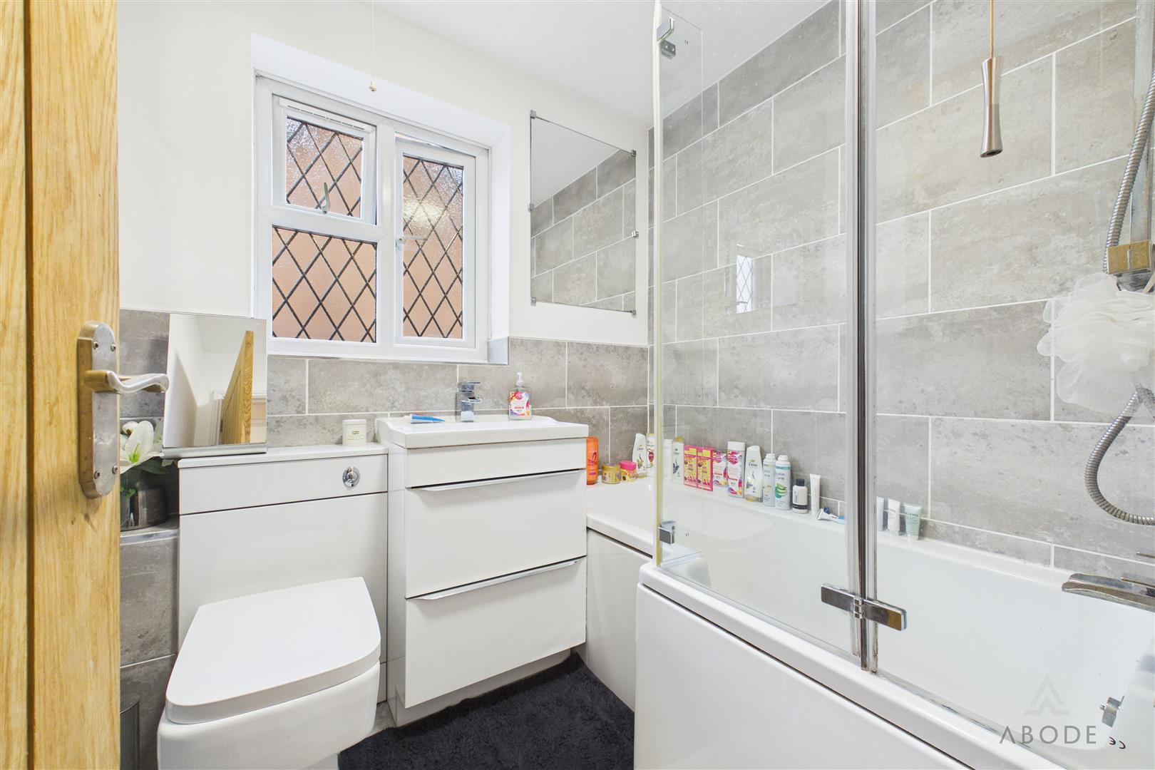 A stylish three-piece suite comprising a low-level WC with concealed cistern, vanity wash hand basin with waterfall mixer tap, and a bath with glass screen and waterfall shower. Finished with complementary tiling to walls and floor, an anthracite heated towel radiator, extractor fan, and a UPVC double glazed frosted window to the side elevation.