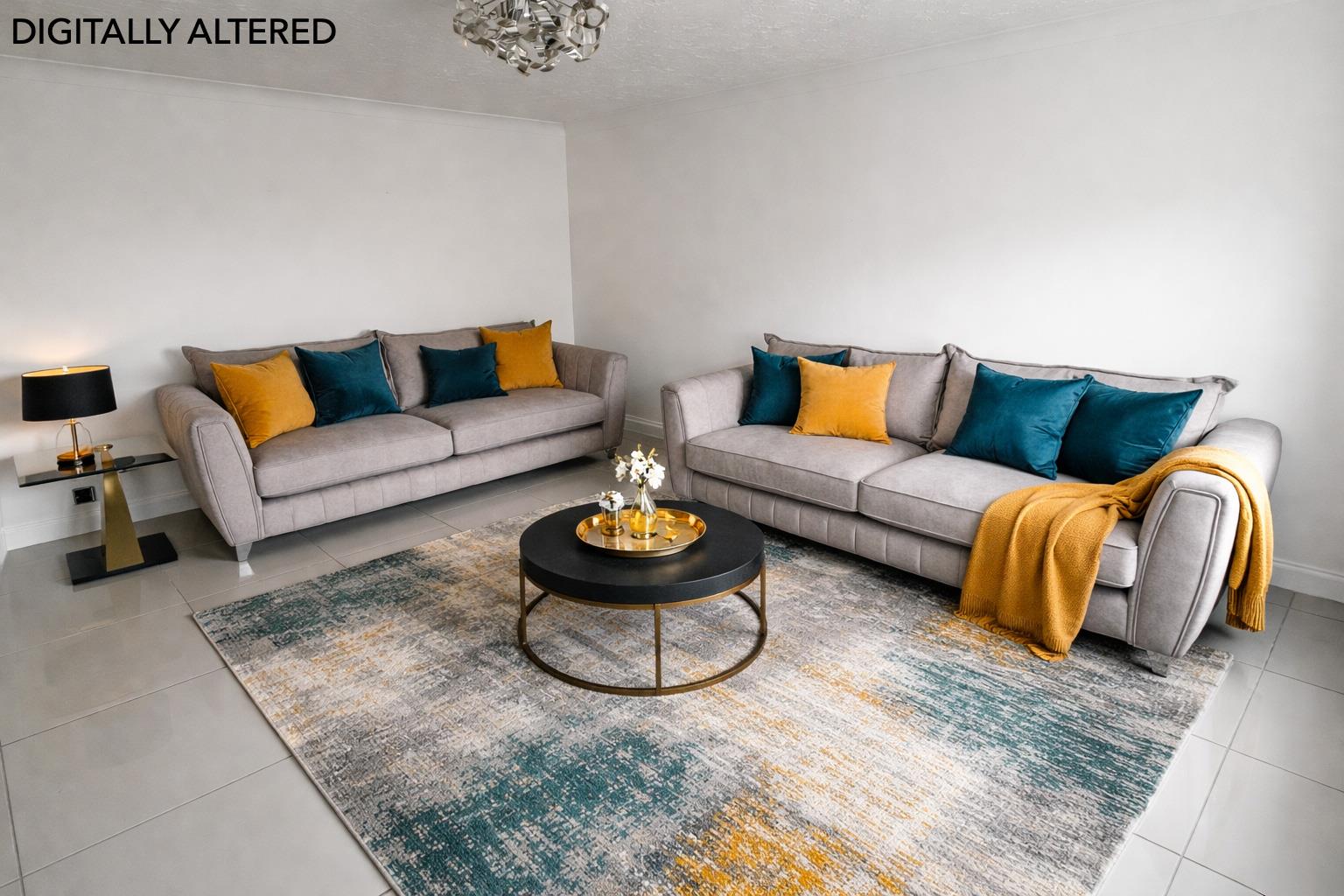 The room is finished with complementary tiled flooring, ceiling spotlights, two central heating radiators, and TV points, creating a stylish yet highly functional living and entertaining space. An opening leads seamlessly through to the extended living area.