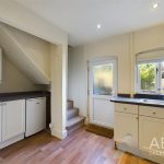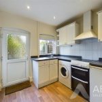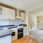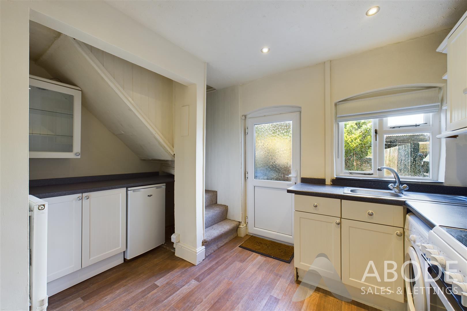 With a double glazed window to the rear elevation, UPVC double glazed frosted door leading into the rear garden, a range of matching base and eye level storage cupboards and drawers with granite effect roll top preparation work surfaces and tiling surrounding. Integrated appliances include a stainless steel sink and drainer with mixer tap, four ring electric hob with oven and grill, extractor hood, plumbing and freestanding space for undercounter white goods, central heating radiator, spotlighting to ceiling and staircase rising to the first floor