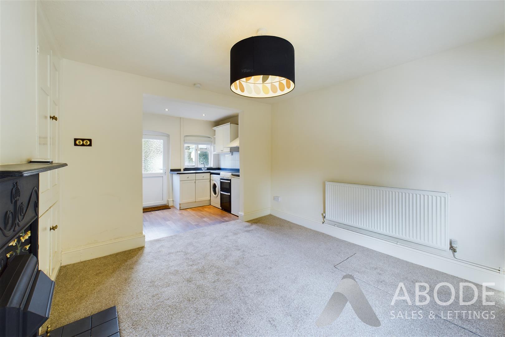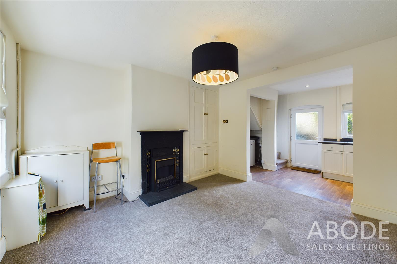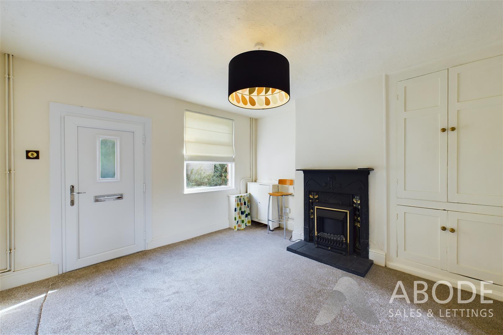 With a double glazed window to the front elevation, UPVC double glazed front entry door leading into, feature fireplace surround and electric fireplace to front with tiled surround and hearth, built-in base and eye level storage cupboards, central heating radiator, meter cupboard housing the electrical consumer unit and electric meter, smoke alarm, gas meter, opening leading to: