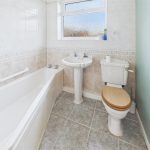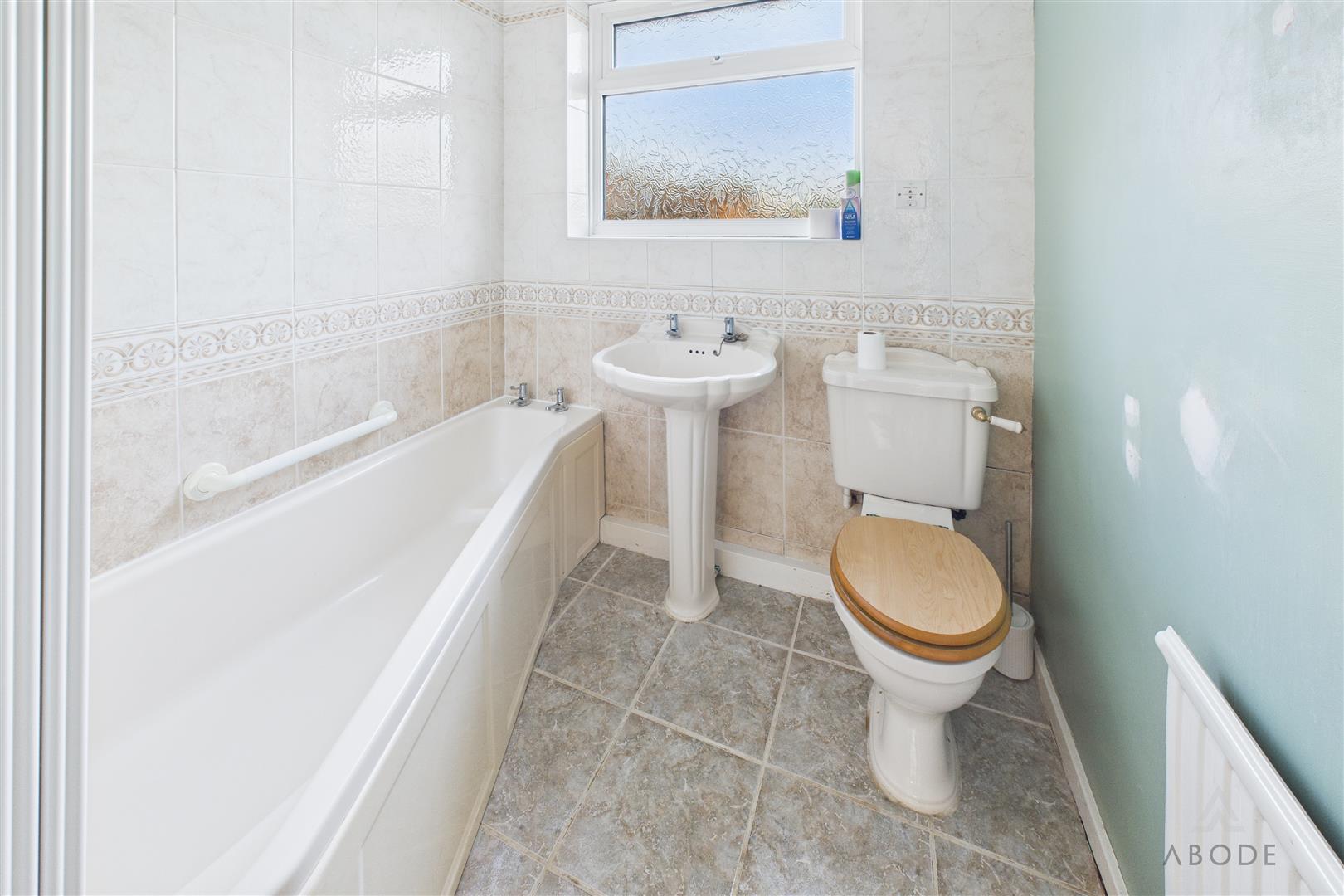 Panel enclosed bath with shower over, wash hand basin, low flush wc, radiator, storage cupboard and a upvc double glazed window.