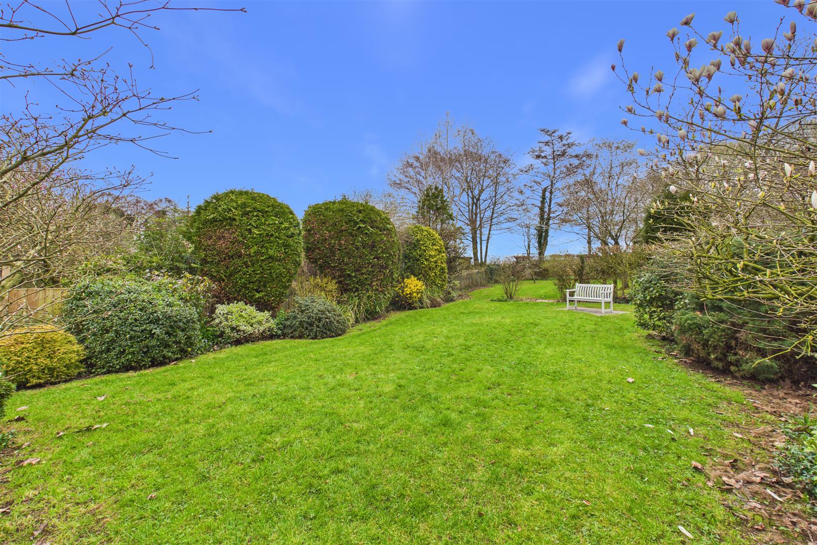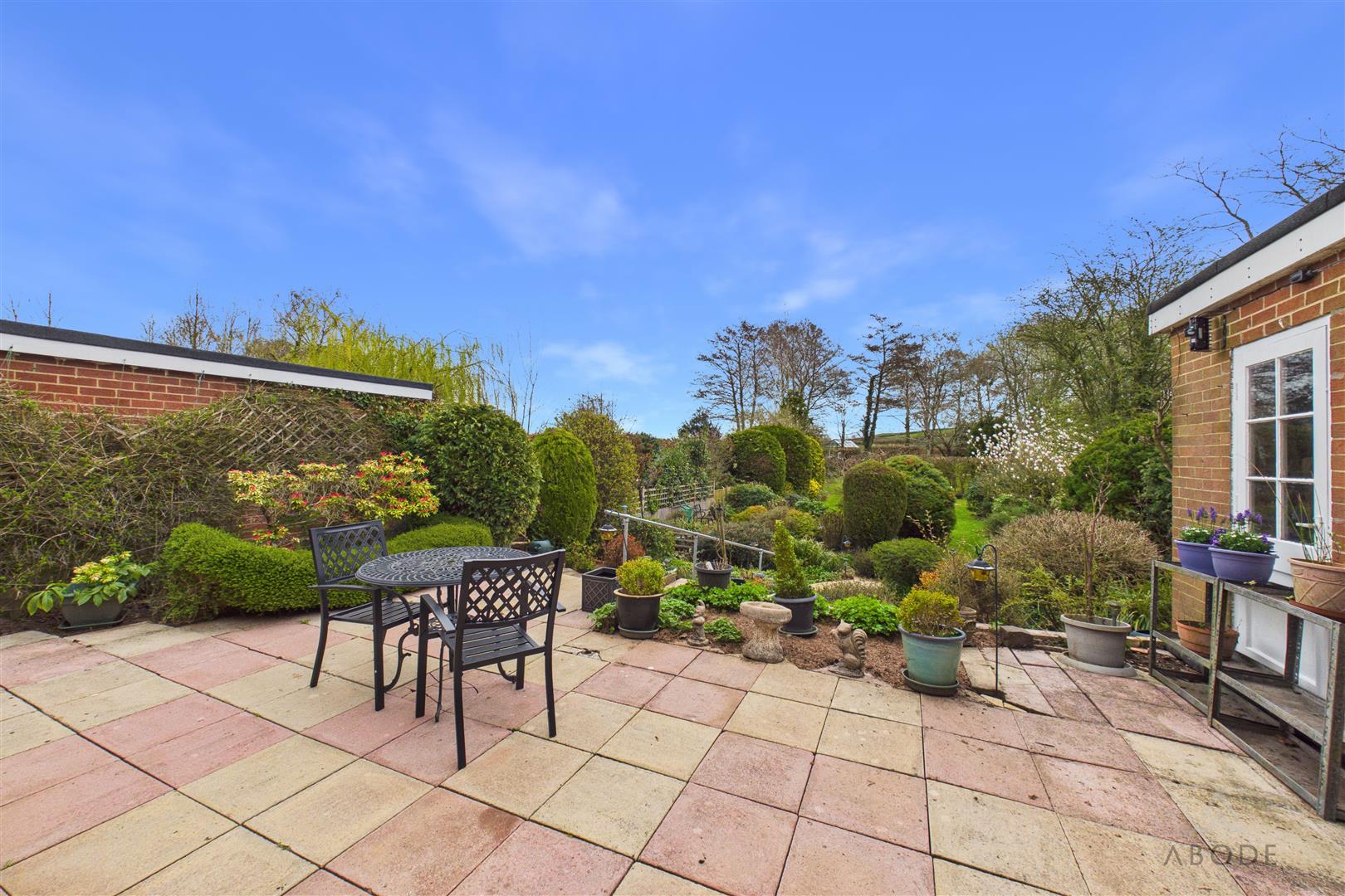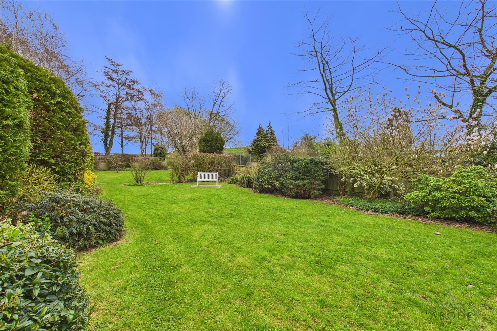 The property boasts an exceptional and well-designed outdoor space, featuring generous patio areas ideal for entertaining, a beautifully maintained lawn with mature planting and trees, and a natural stream running through the garden, creating a truly unique setting.