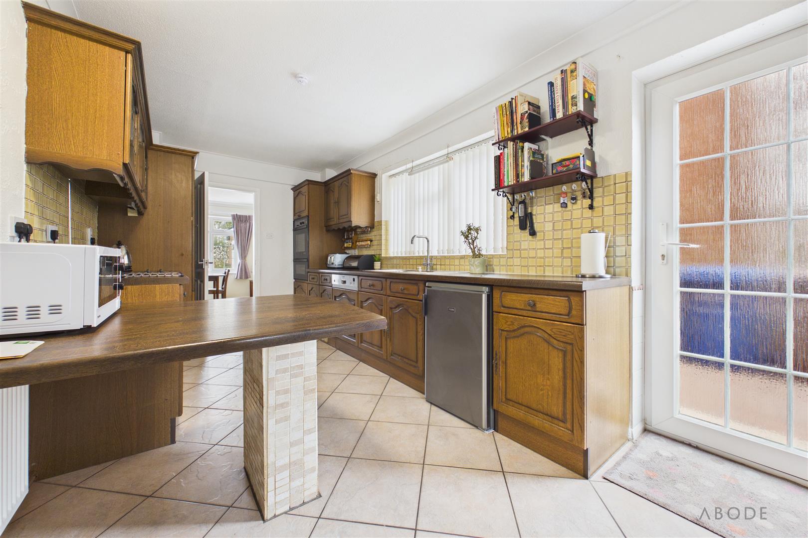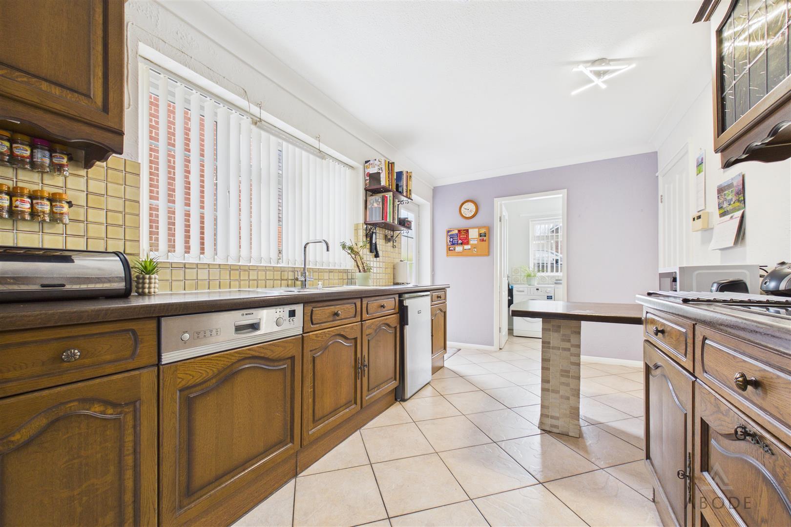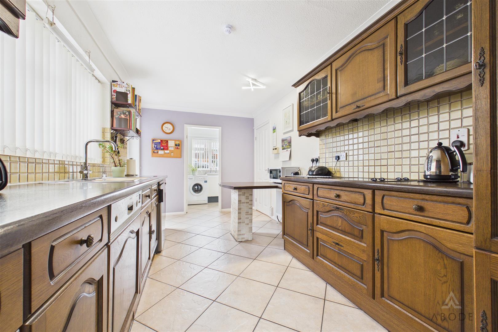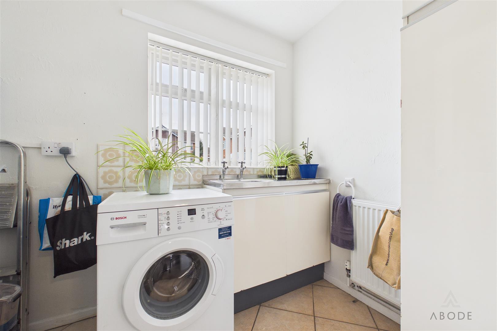 Providing additional storage and practicality, with base units, space and plumbing for freestanding appliances, a stainless steel sink and drainer, central heating radiator, and a UPVC double glazed window to the front elevation. Also housing the electrical consumer unit and meter.