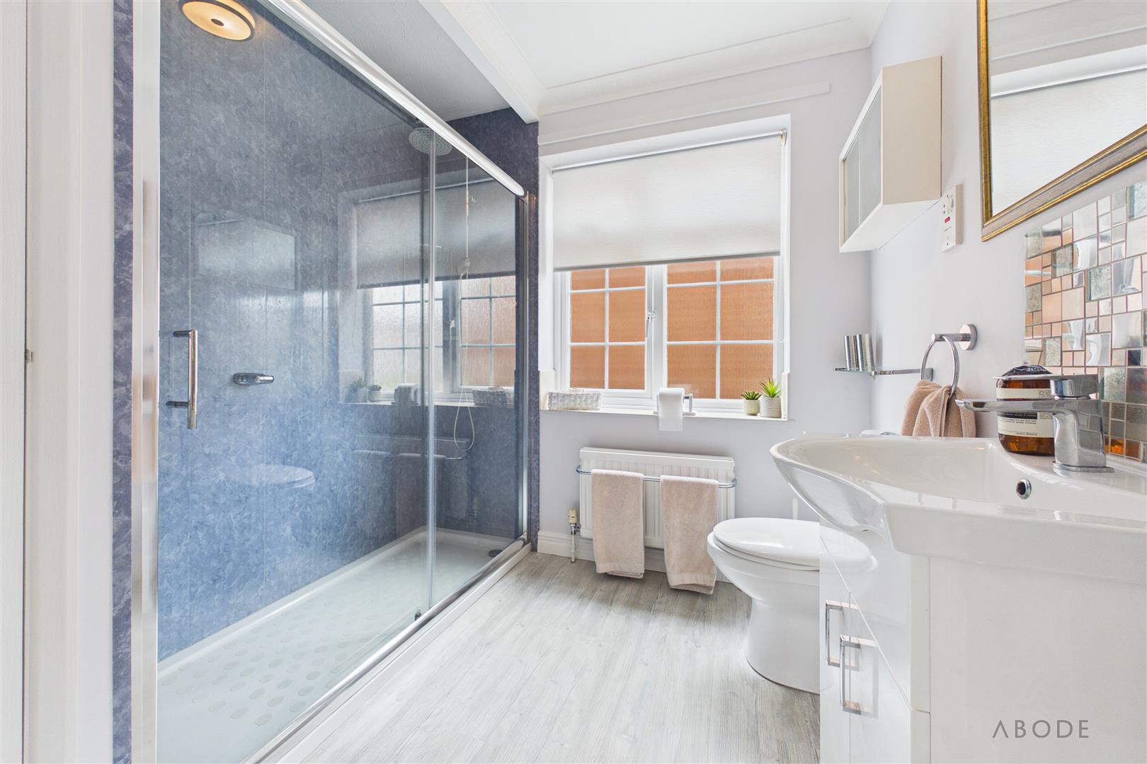Fitted with a modern three-piece suite comprising a low-level WC, wash hand basin with mixer tap, and a double shower cubicle with sliding glass screen and waterfall showerhead. Additional features include a heated towel radiator, large built-in storage cupboard, central heating radiator, shaving point, and a UPVC double glazed frosted window to the side elevation.