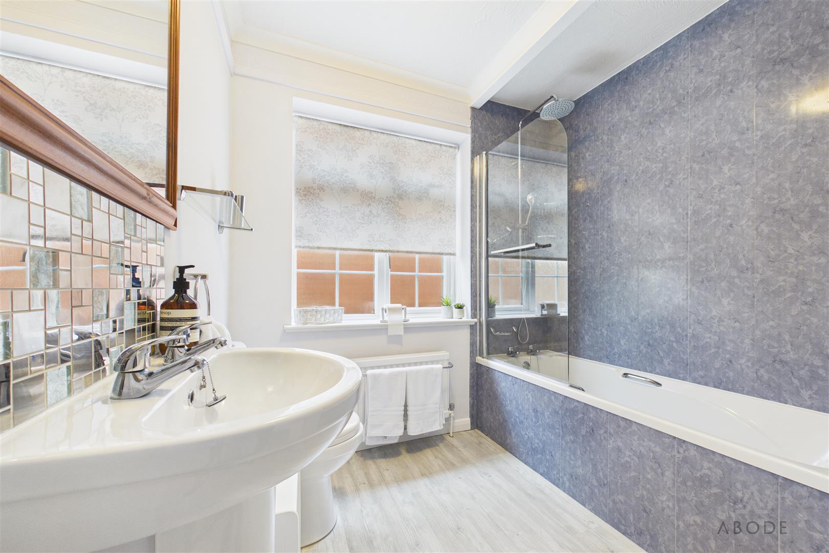 Fitted with a three-piece suite comprising a low-level WC, pedestal wash hand basin, and bath with glass screen and waterfall shower over. Additional features include a central heating radiator and a UPVC double glazed frosted window to the side elevation.