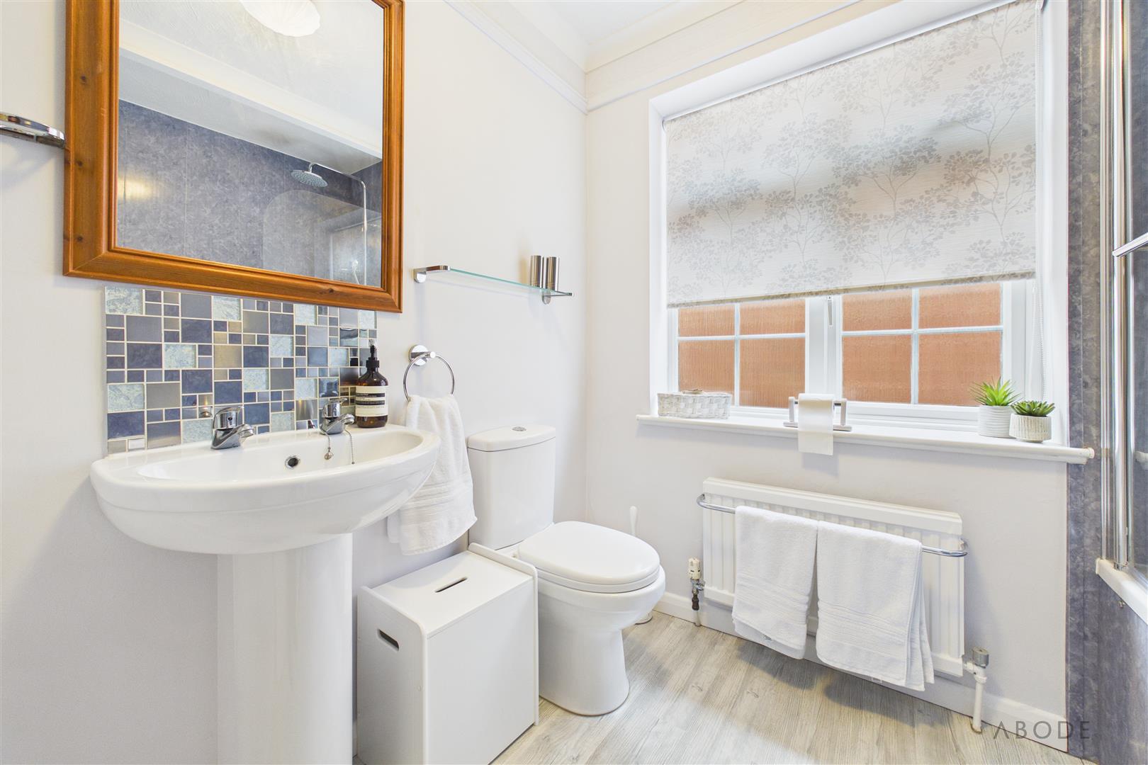 Fitted with a low-level WC and pedestal wash hand basin, complemented by a UPVC double glazed frosted window to the front elevation and a central heating radiator.