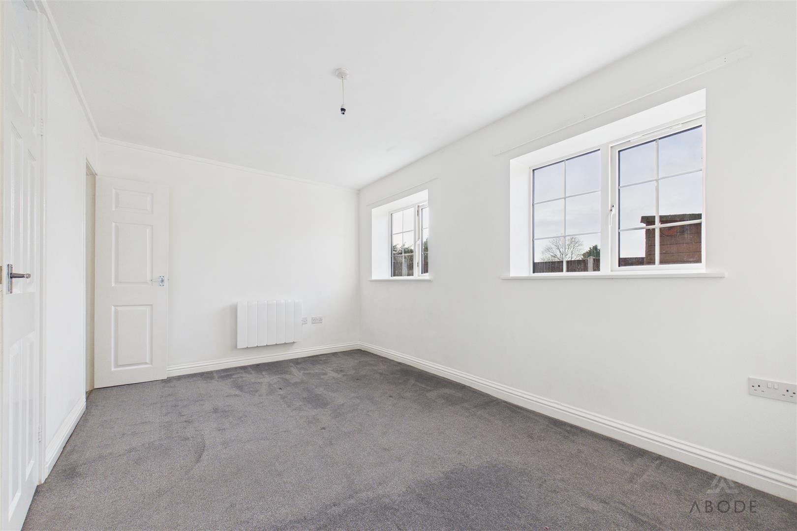 Second bedroom with two UPVC double-glazed windows to the rear elevation, electric radiator, and a built-in storage cupboard.