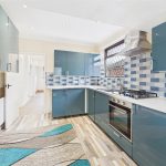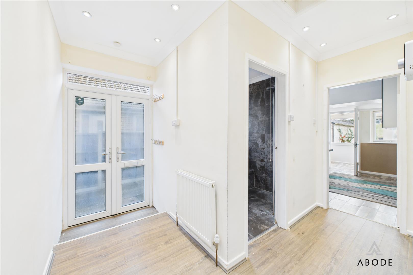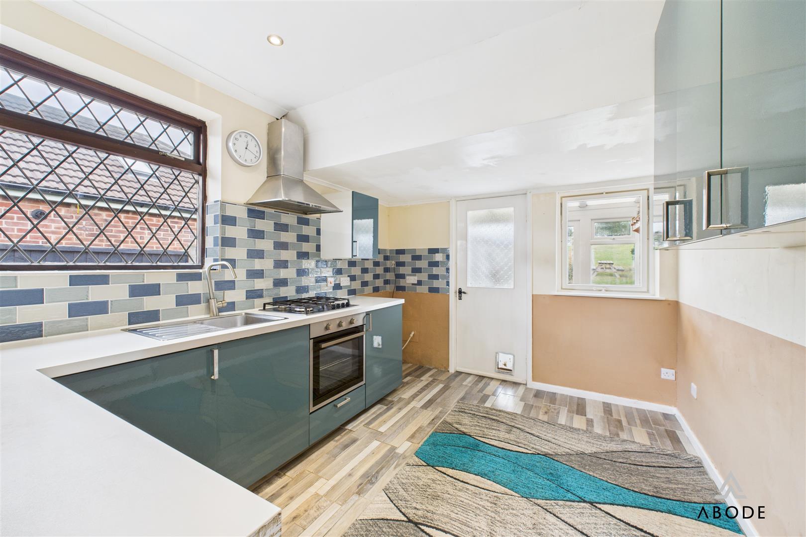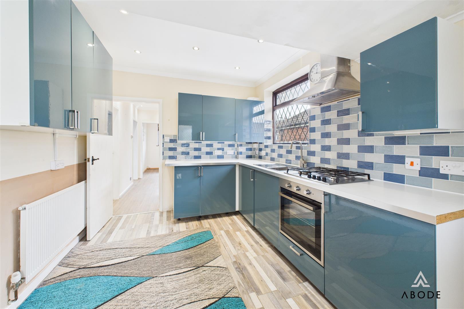 The modern kitchen is fitted with a range of gloss units, contrasting work surfaces, tiled splash backs, and integrated appliances, with access to a useful utility area and side porch.