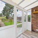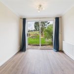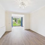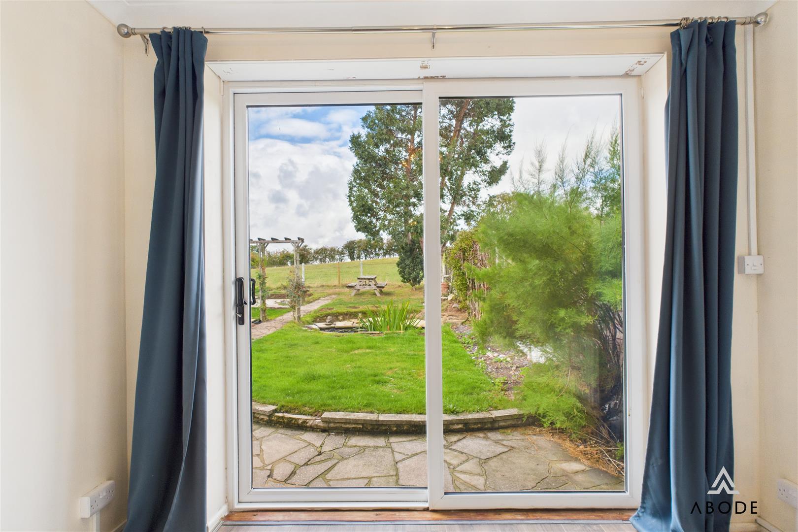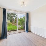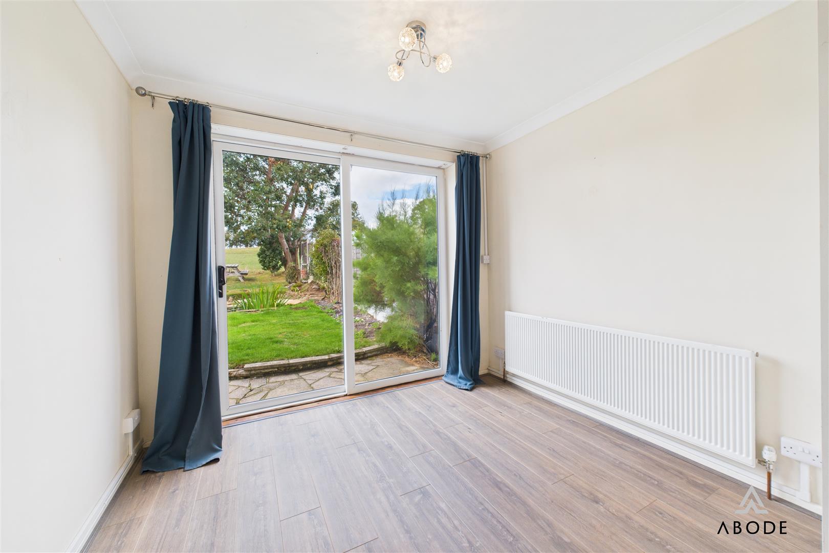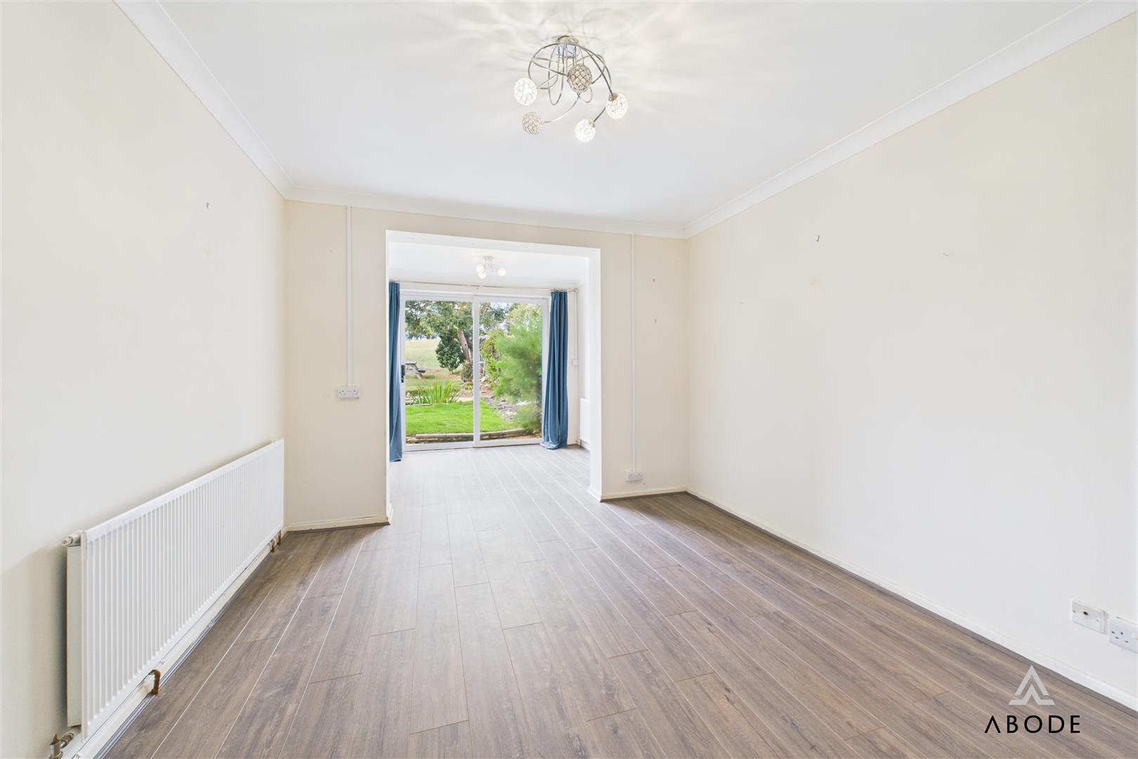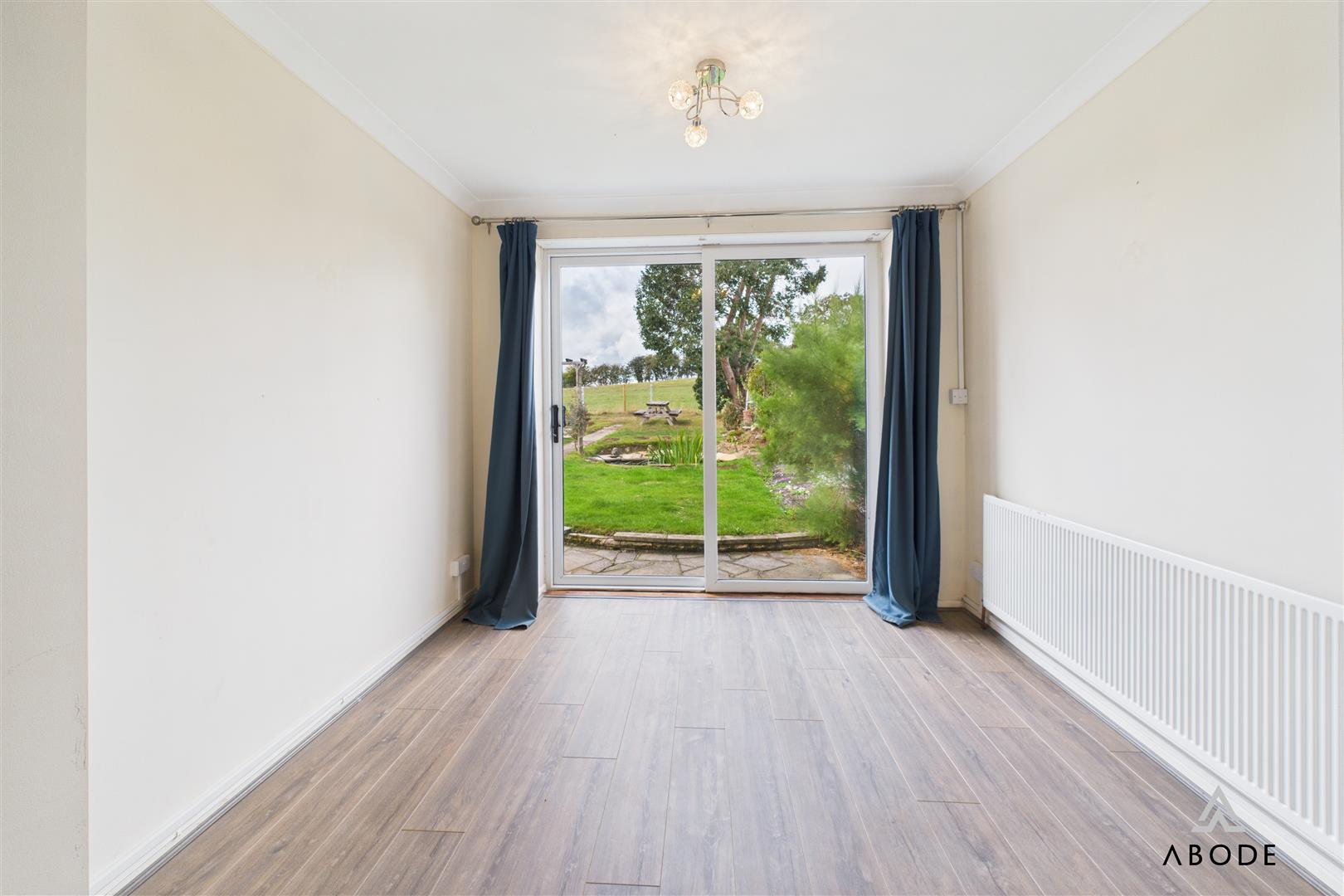 The property is accessed via a front entrance door leading into a central hallway with access to the main living areas. The spacious living room is positioned to the rear, enjoying natural light and direct views over the garden and fields beyond, with sliding patio doors opening outside. A separate dining room adjoins the living room, creating a versatile second reception space.