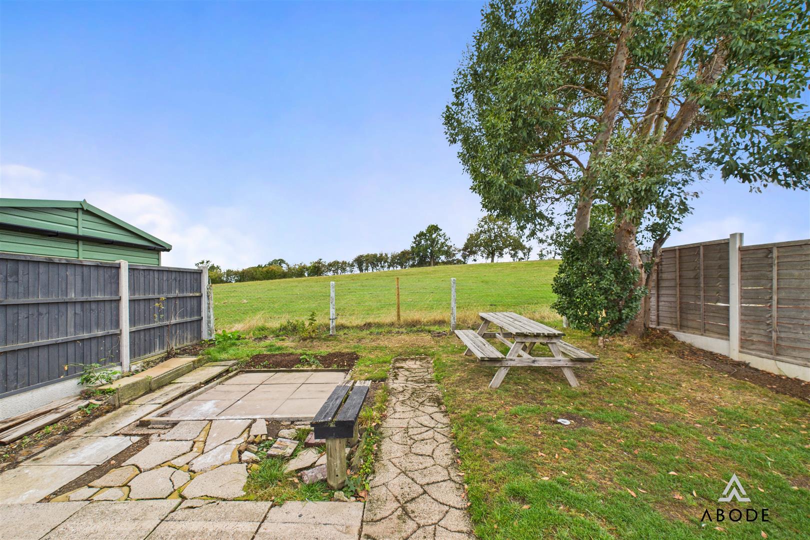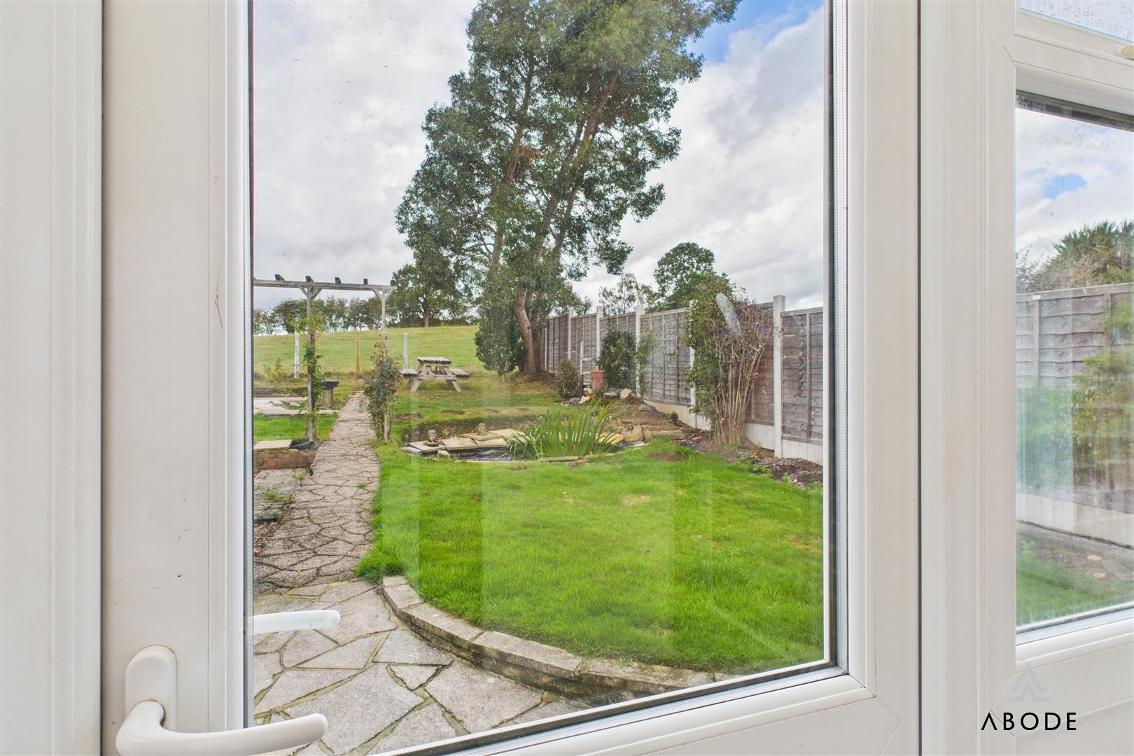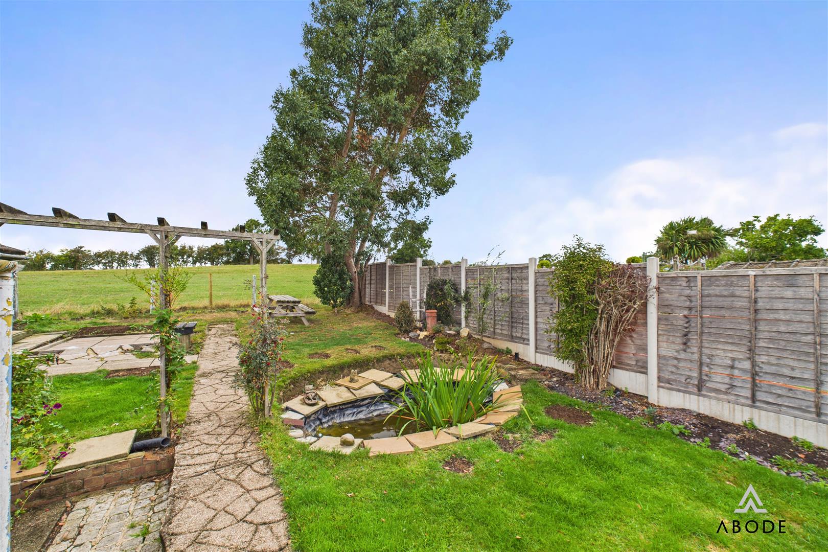 To the front, a block-paved driveway provides ample off-street parking. The rear garden is a standout feature, landscaped with lawn, pond, and seating areas, while backing directly onto open fields. The uninterrupted rural outlook delivers an exceptional sense of space and privacy, making this garden ideal for both relaxation and entertaining.