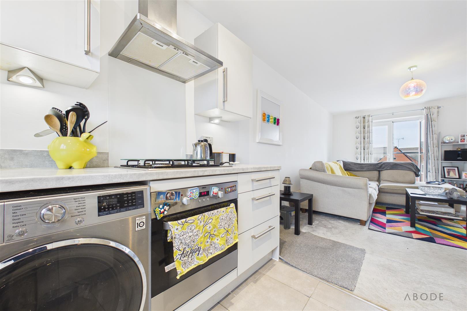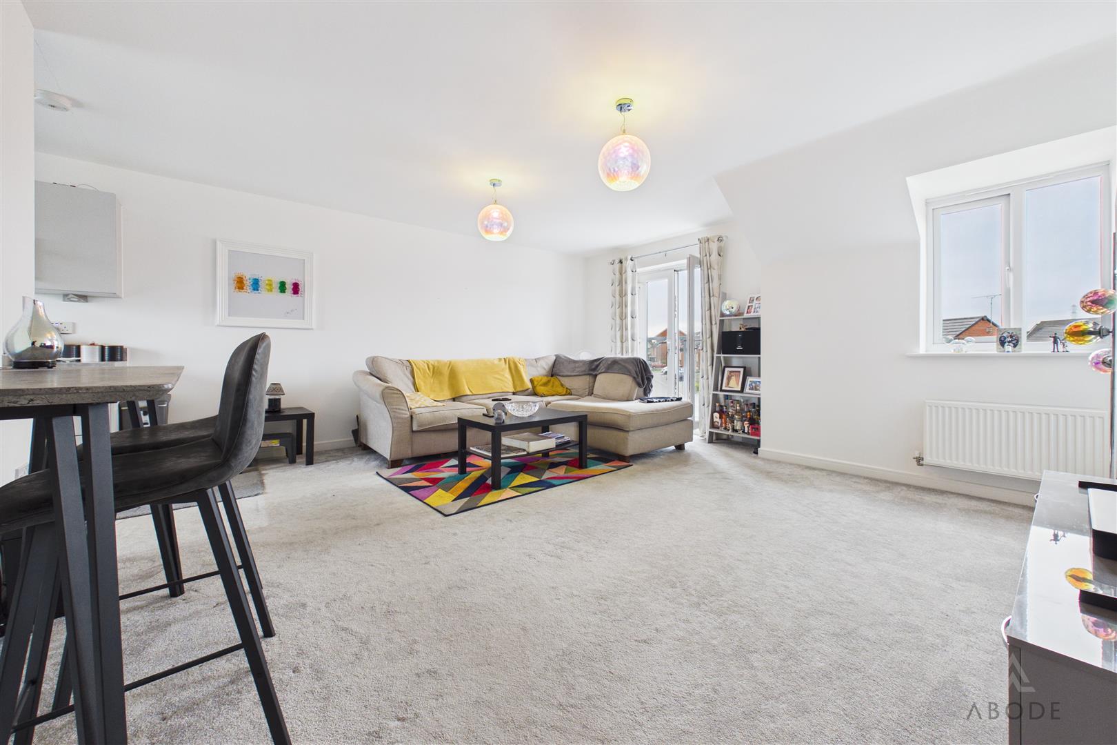 A bright and spacious open-plan living area with a UPVC double glazed windows to the front elevation, allowing for plenty of natural light and a set of UPVC double glazed doors leading to a Juliet balcony. The space benefits from three central heating radiators, carpeted flooring throughout and TV and telephone points.