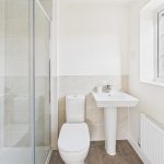With a UPVC double glazed glass window to the side elevation, featuring a three-piece shower room suite comprising of low level WC, pedestal wash hand basin with mixer tap, double shower cubicle with sliding glass screen and complementary tiling to wall coverings, central heating radiator, shaving point and extractor fan.