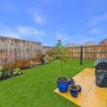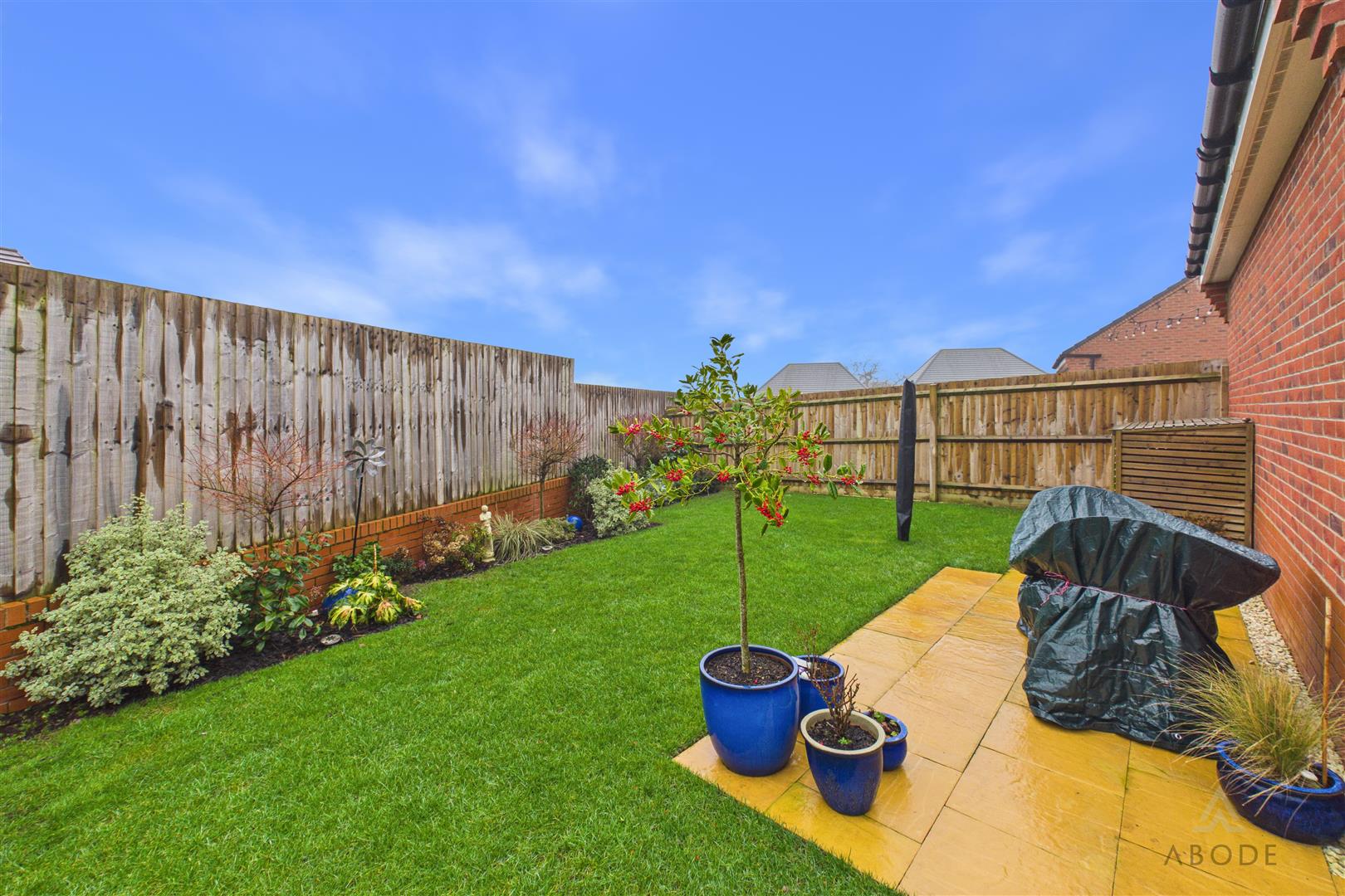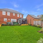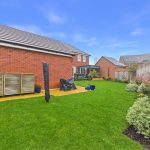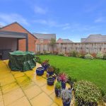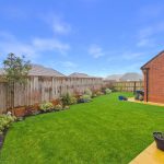 The garden is fully enclosed by timber fencing, offering excellent privacy, with mature planting, decorative trellis panels and shrubs adding colour and structure. To the rear, the detached double garage is visible, positioned discreetly away from the main garden space. Overall, the garden feels spacious, well cared for and perfectly suited to both families and summer entertaining.