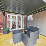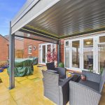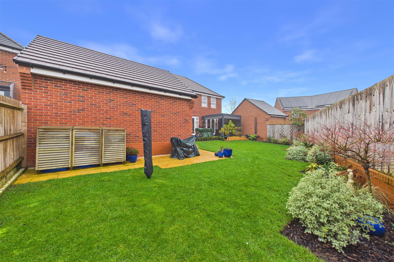 The garden showcases a private, landscaped rear garden with a generous, neatly maintained lawn framed by well-stocked planted borders. A paved pathway runs along the side of the property, leading to a raised patio area directly outside the house. This patio features a contemporary covered seating area/pergola, creating an ideal space for outdoor dining and entertaining.