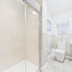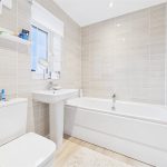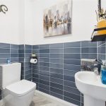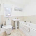 Comprising a low-level WC, wash hand basin with mixer tap, central heating radiator, complementary half-height wall tiling and extractor fan.