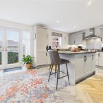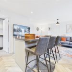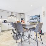 The ground floor is designed with modern family life in mind, featuring a welcoming entrance hall, a versatile home office/study, and a spacious lounge leading through to a formal dining room. At the heart of the home is the stunning open-plan kitchen diner, fitted with integrated AEG appliances and a breakfast bar, with French doors opening directly onto the rear garden, making it ideal for both everyday living and entertaining. A separate utility room and downstairs WC complete the ground floor.