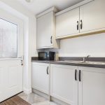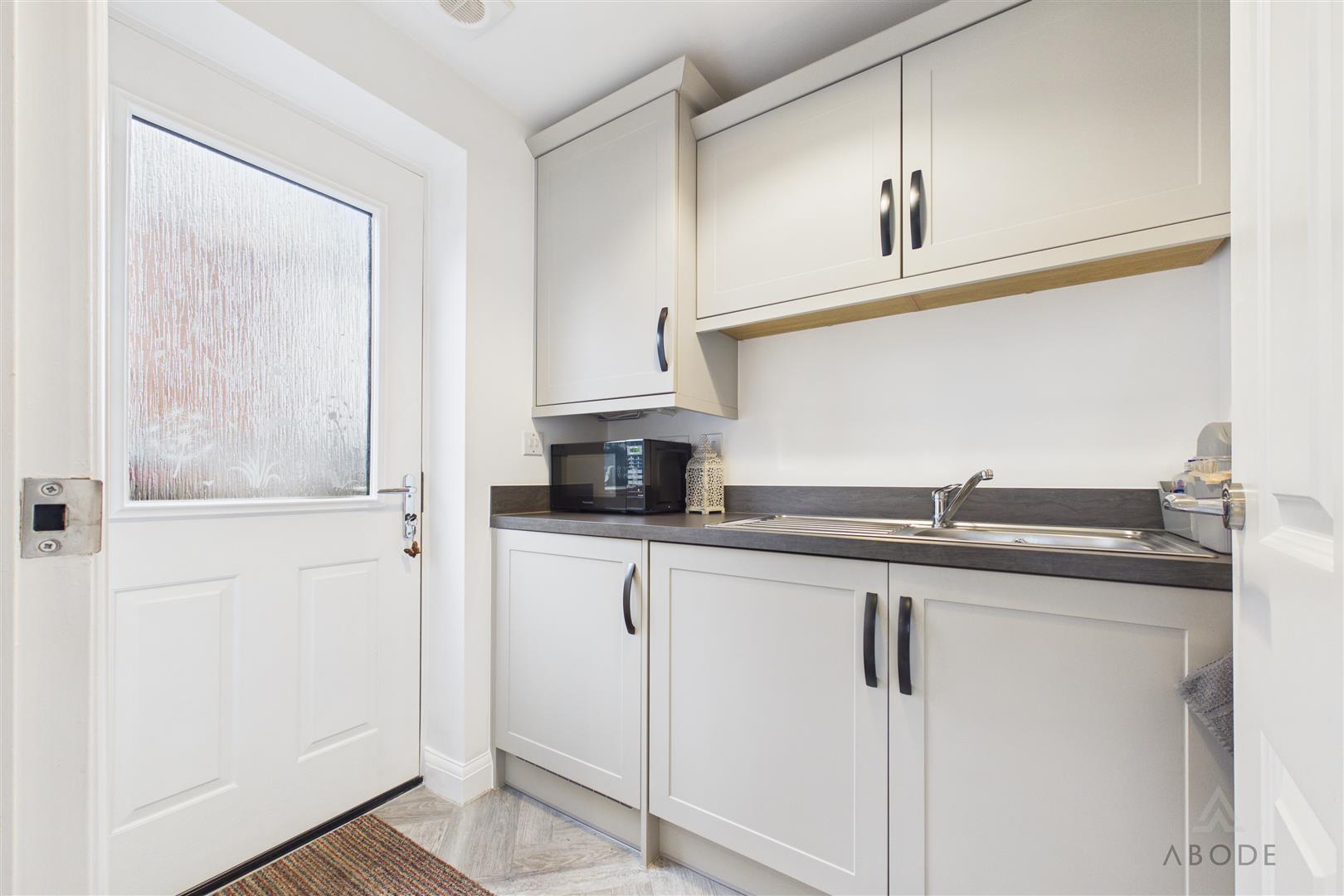 With a composite double-glazed frosted side entrance door. Fitted with matching base and wall units, drop-edge work surfaces and an integrated stainless steel sink and drainer with mixer tap. Housing the central heating boiler, with extractor fan, central heating radiator and carbon monoxide detector.