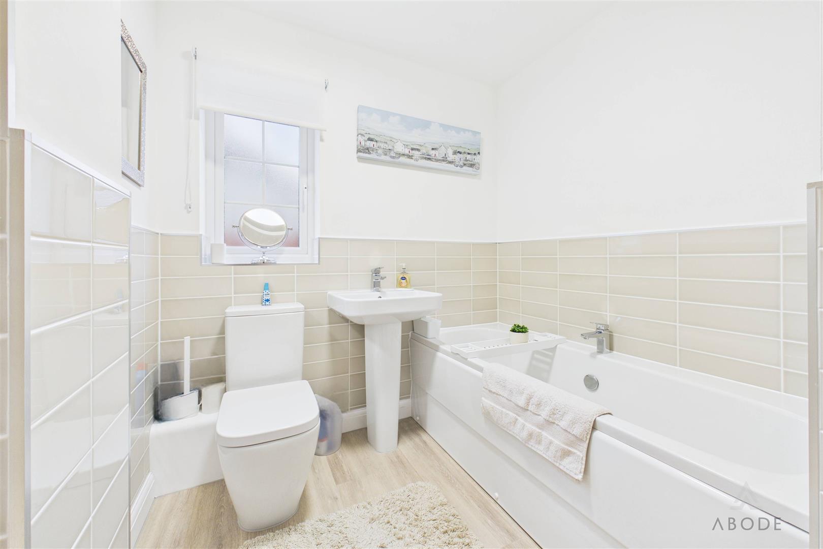 With a UPVC double-glazed frosted window to the side elevation. The four-piece suite comprises a low-level WC, pedestal wash hand basin with mixer tap, bath with mixer tap, and double shower cubicle with sliding glass screen. Finished with complementary wall tiling, spotlighting to the ceiling, heated towel radiator and extractor fan.