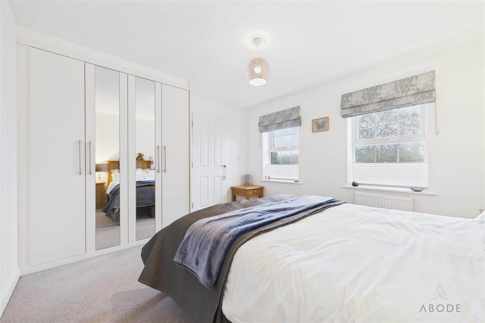 A generous principal bedroom with two UPVC double-glazed windows to the rear elevation, fitted with built-in blinds. Featuring an extensive range of double built-in wardrobes with mirrored fronts, hanging rails and shelving. Additional features include a central heating radiator, thermostat and access to the en-suite.