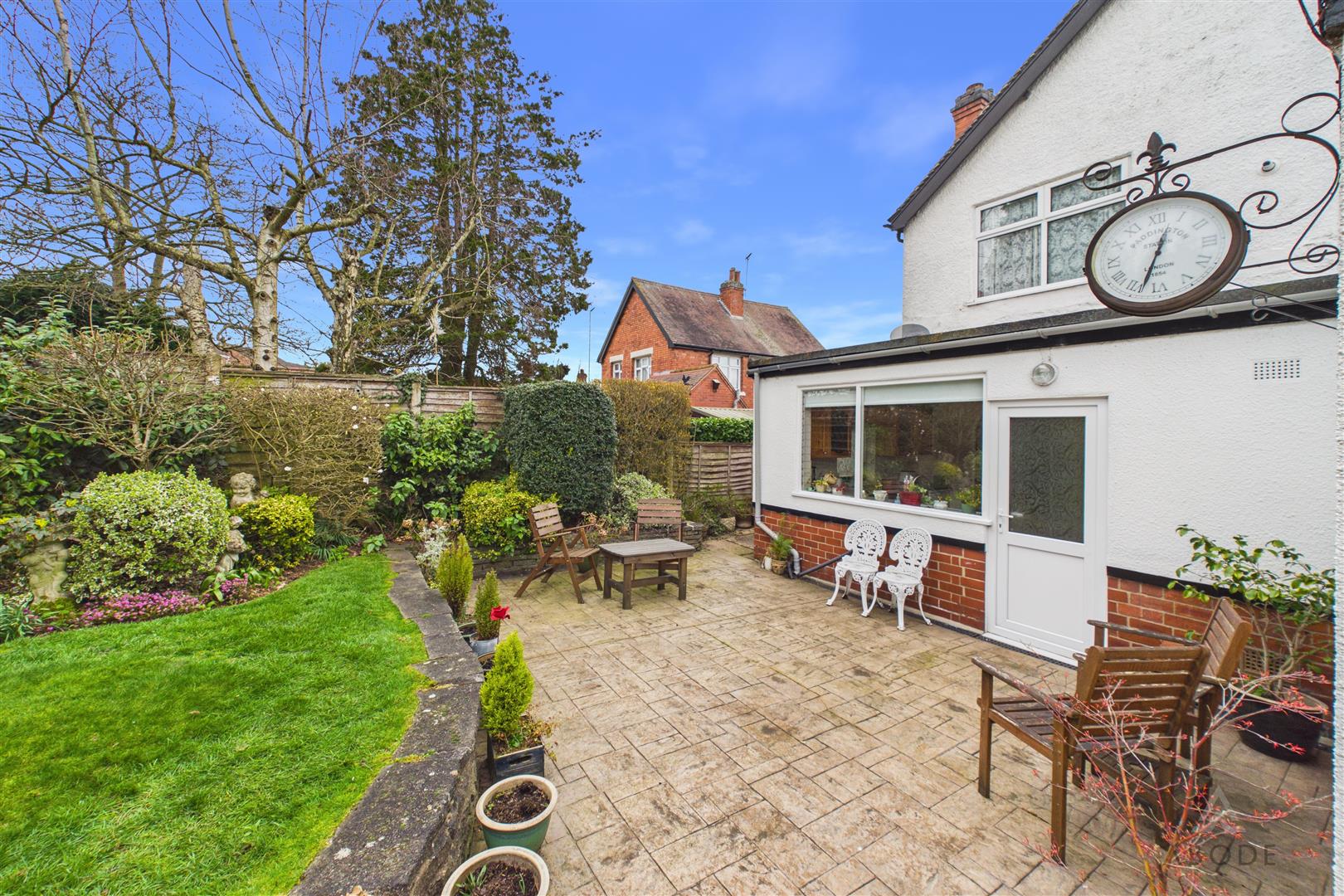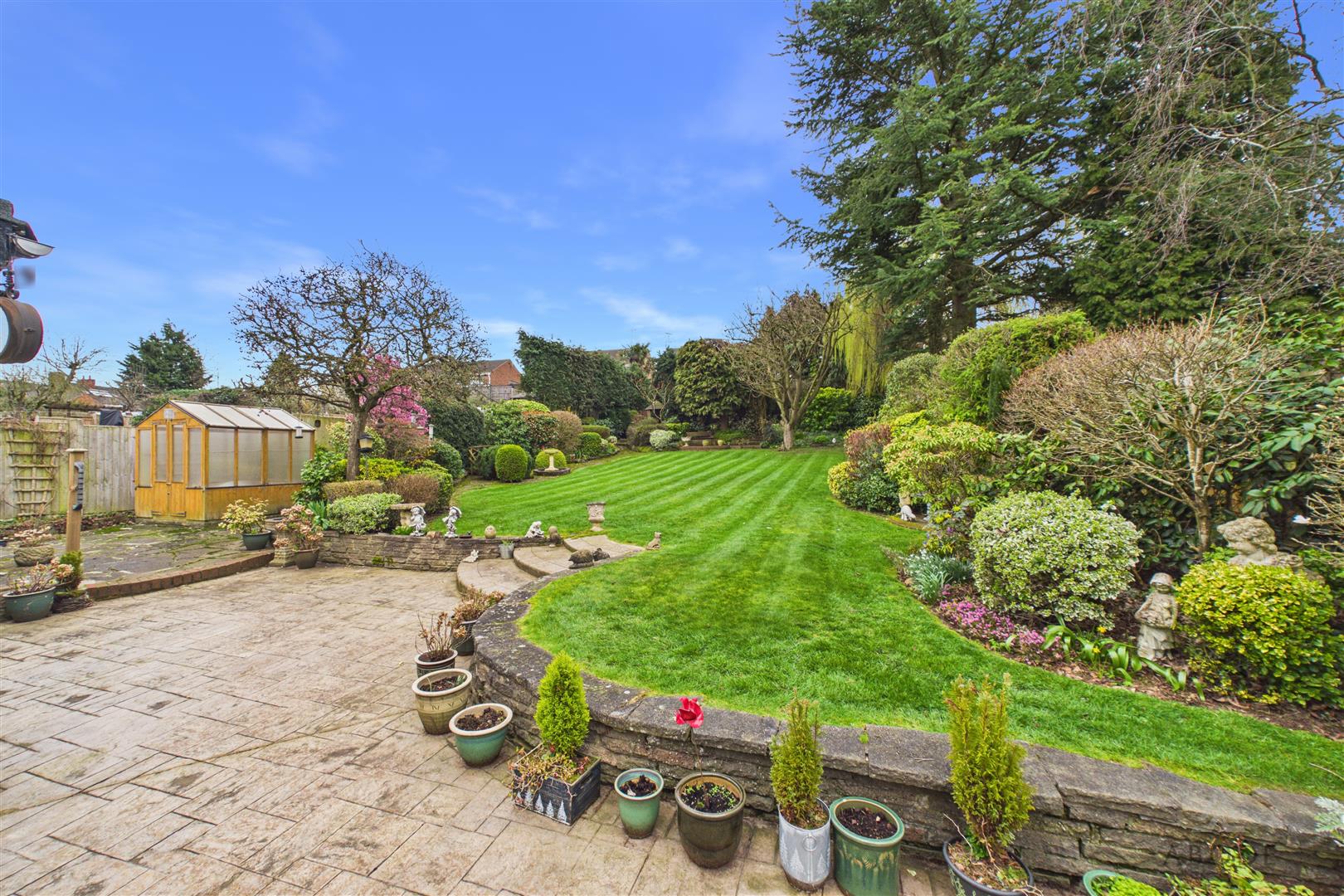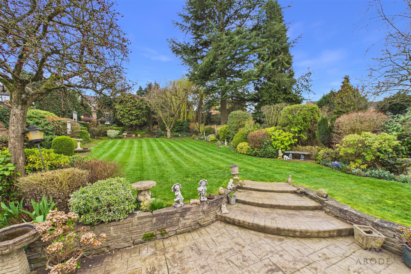 The rear garden is a standout feature of the property and has been beautifully maintained over many years. A paved patio area directly behind the house provides an ideal seating and entertaining space, with steps leading up to an extensive lawn. The garden continues a considerable distance behind the property and is bordered by mature trees, shrubs and planting, creating a private and peaceful outdoor environment. Further features include additional seating areas, a greenhouse and established planting throughout, offering a wonderful garden setting rarely available within this location.
